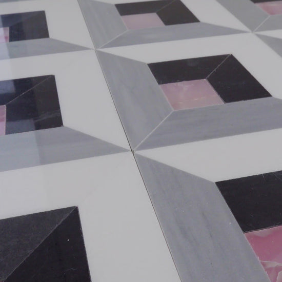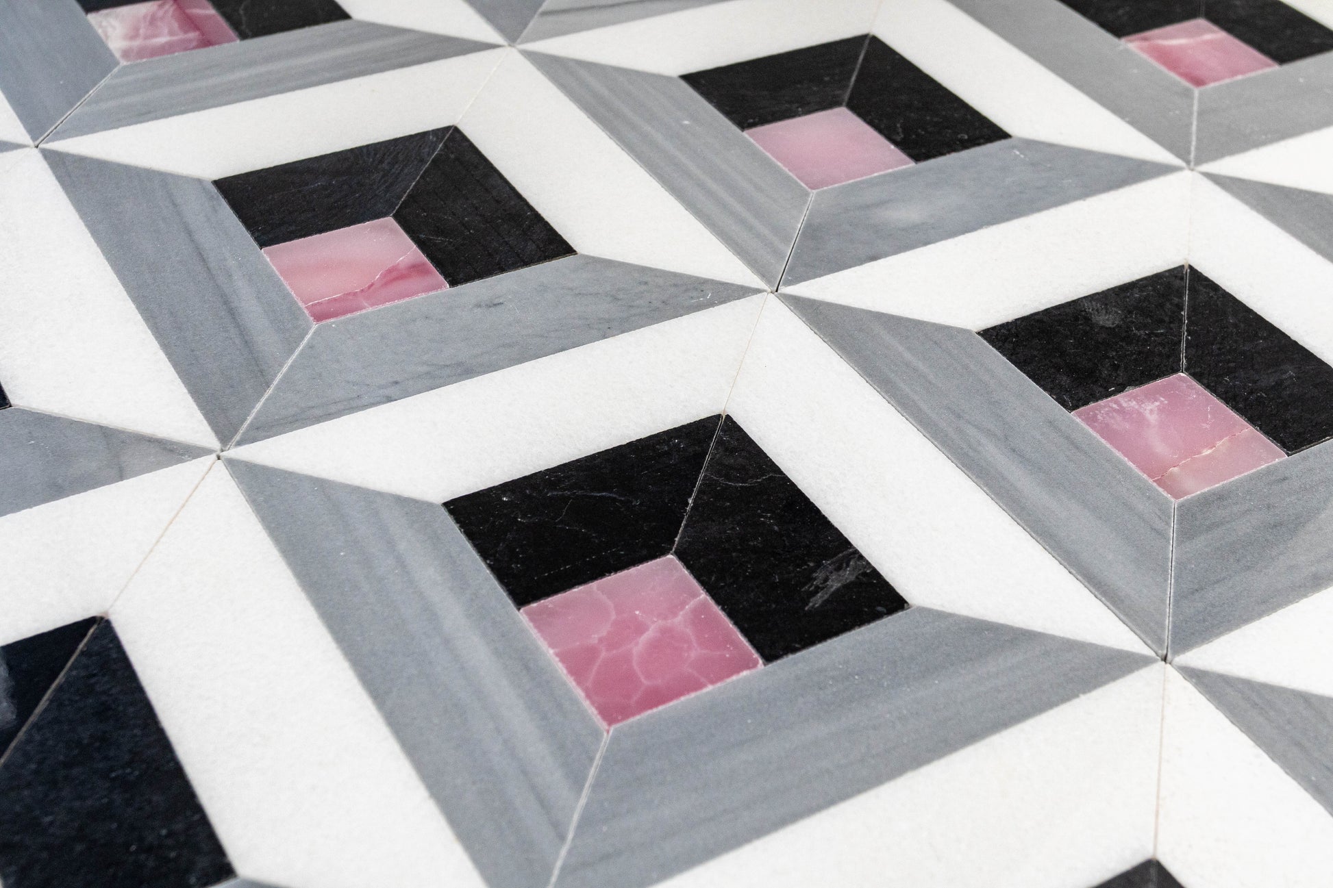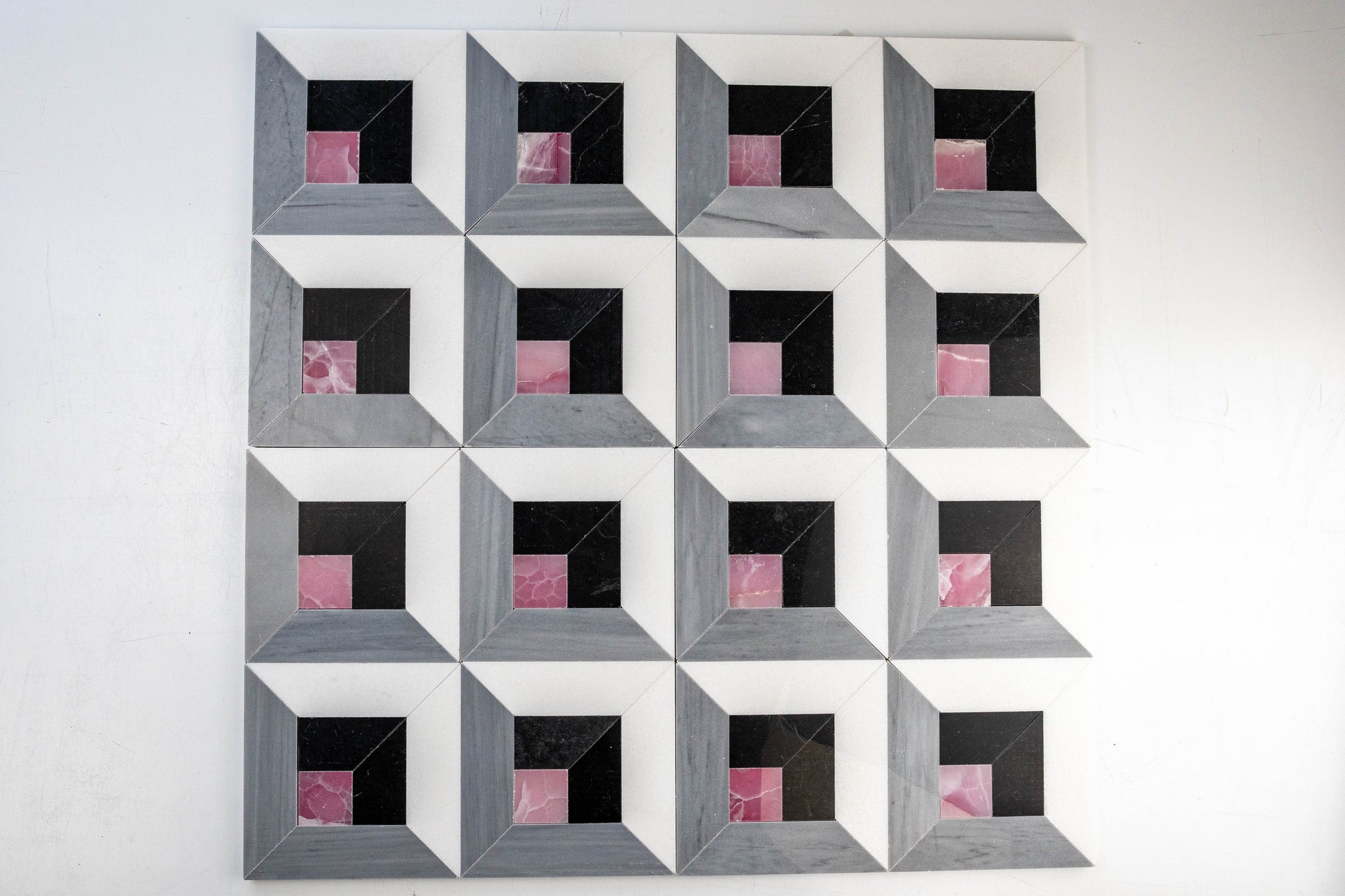A fun twist on a modern square pattern. Arden features a beautiful pink onyx center surrounded by cool tones to create a truly unique design. Pair this mosaic with other pink tones or keep the rest of the room monotone to let the pink pop!