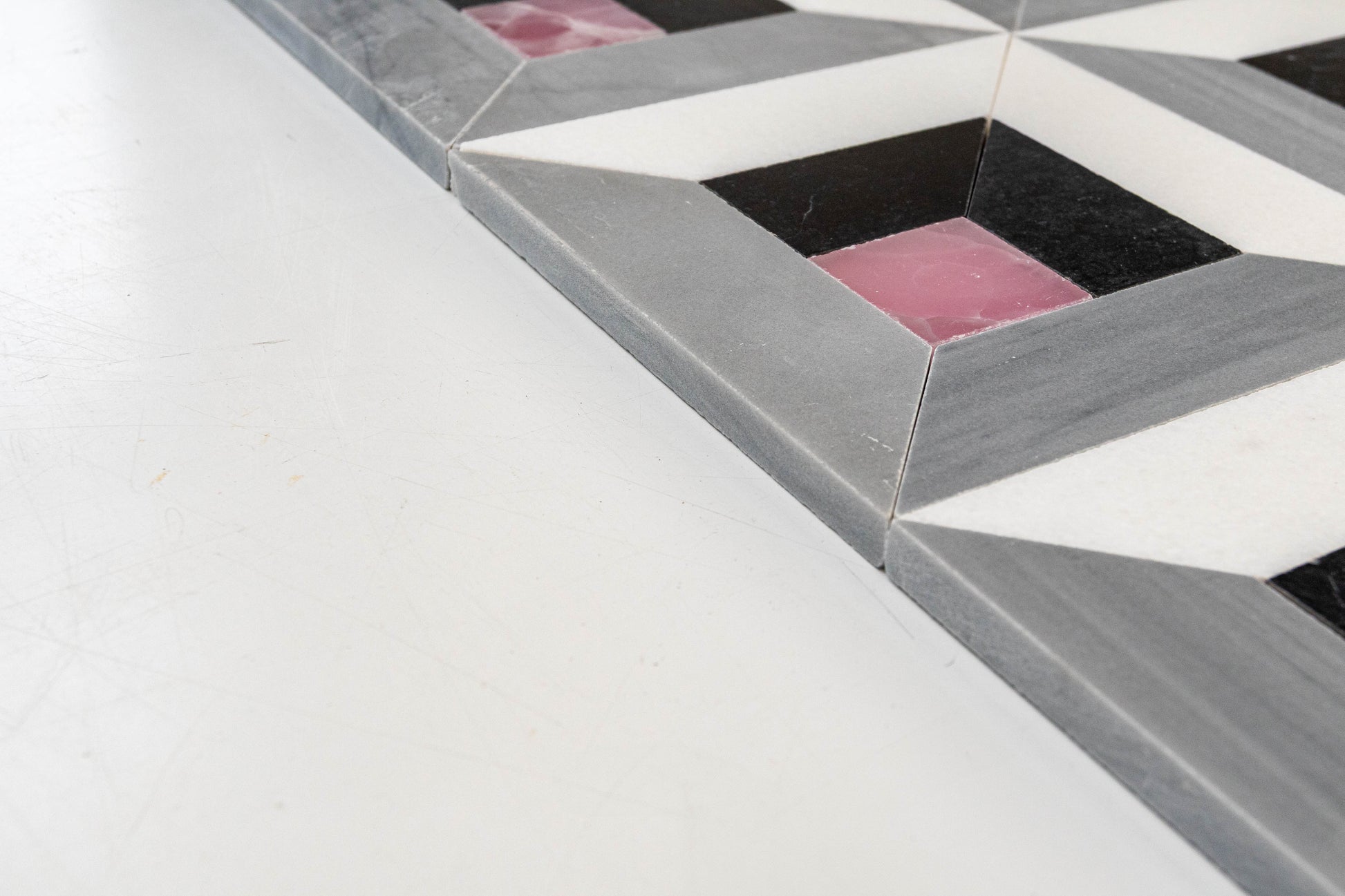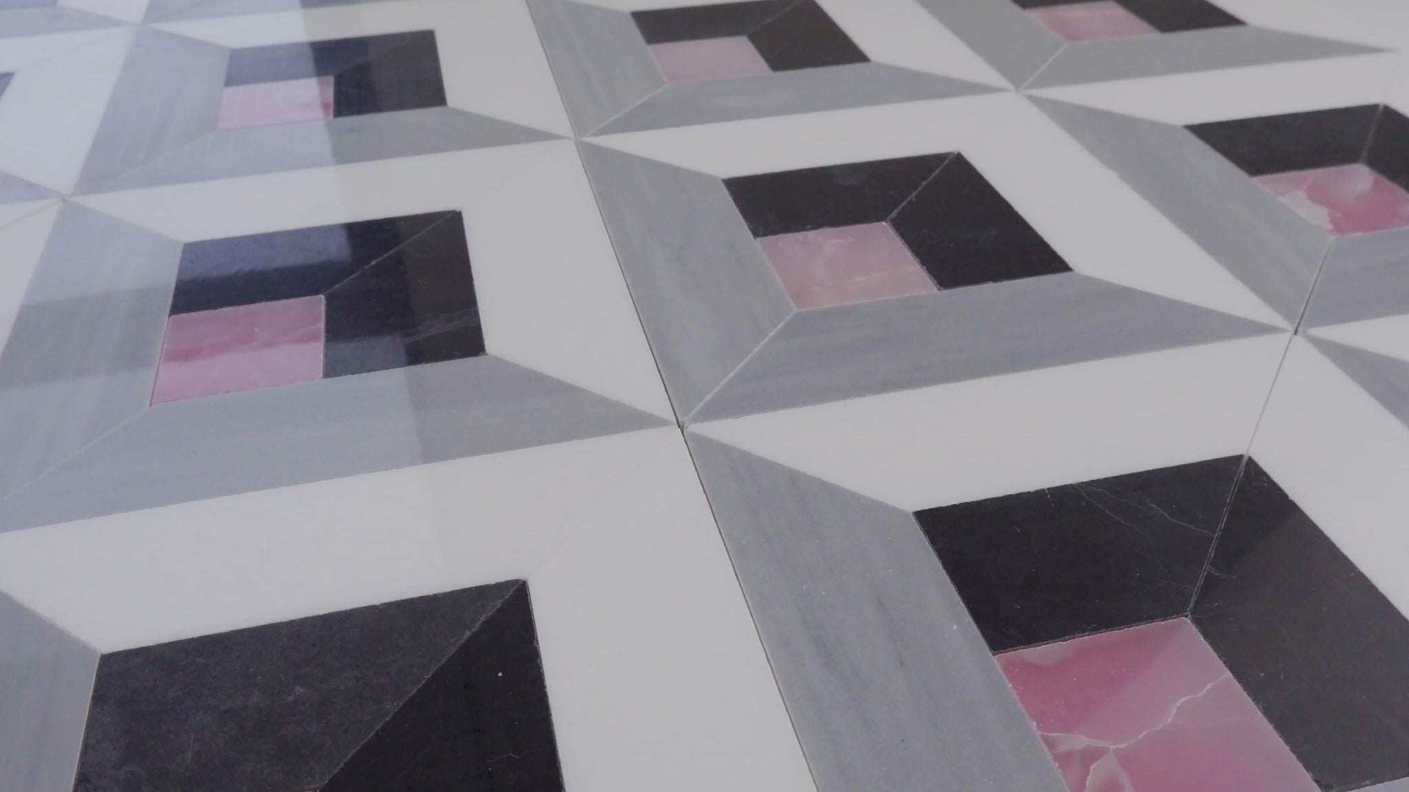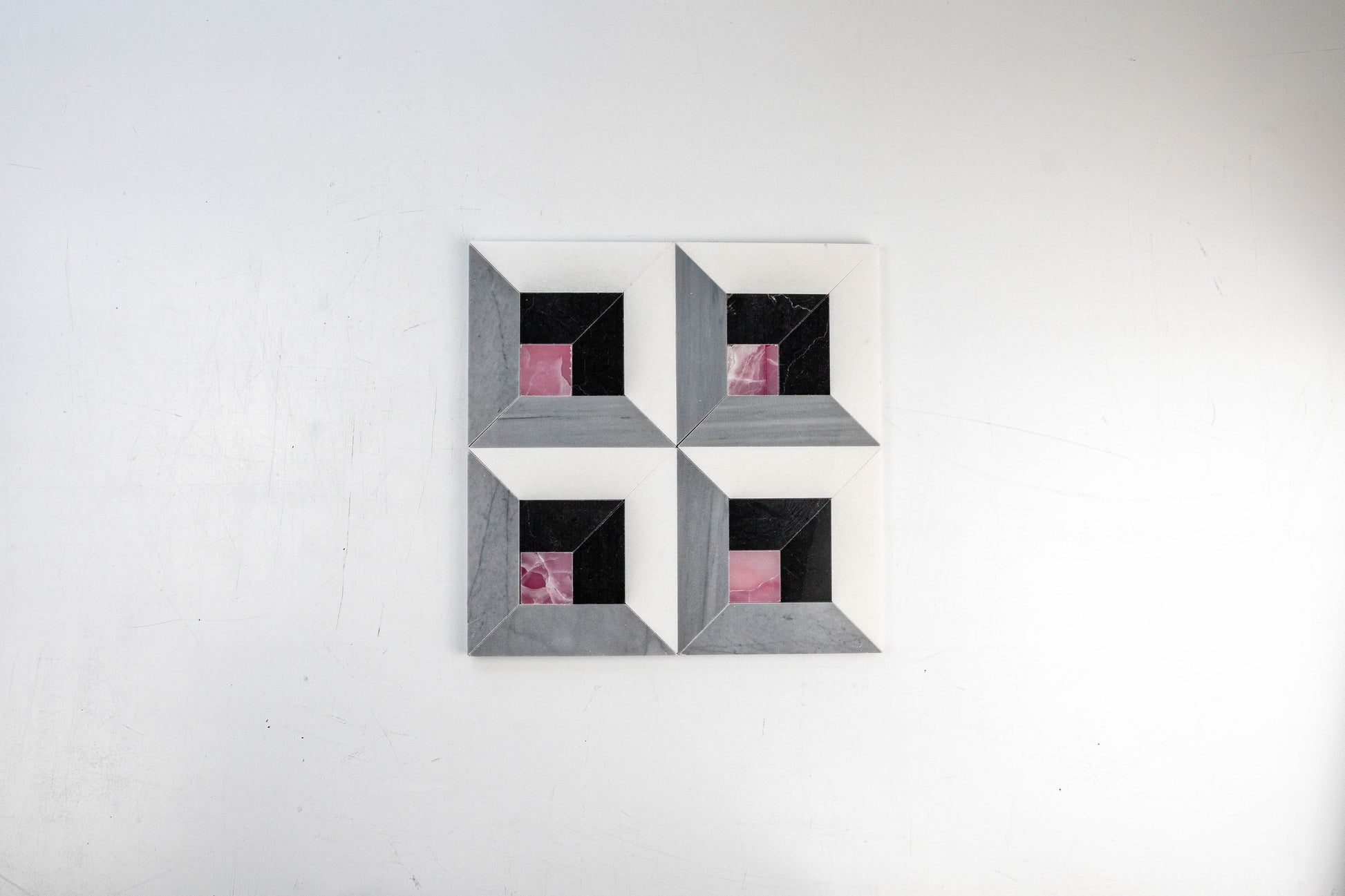A fun twist on a modern square pattern. Arden features a beautiful pink onyx center surrounded by cool tones to create a truly unique design. Pair this mosaic with other pink tones or keep the rest of the room monotone to let the pink pop!