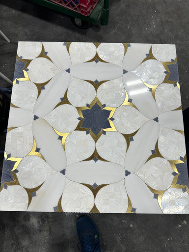 Alhambra waterjet features a stunning floral design with accents of small mosaics to add to its elegance. All Waterjet patterns are available for customization, allowing you to tailor stones, colors, materials, and finishes to match your unique vision.