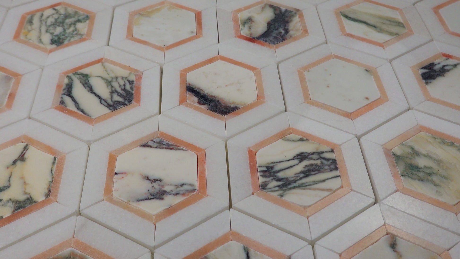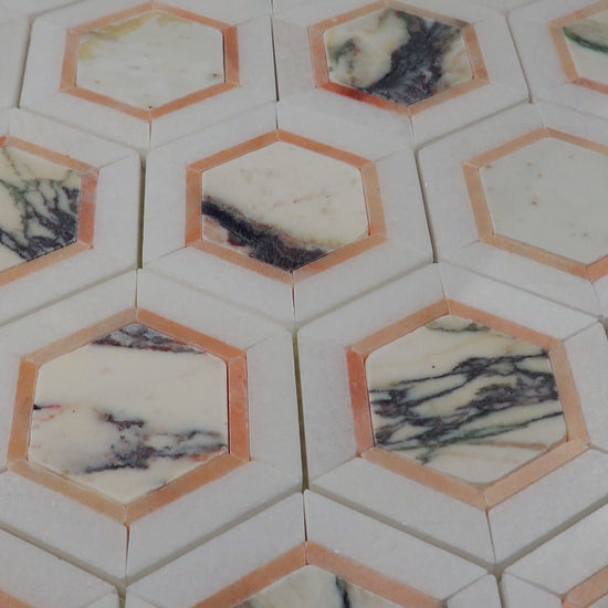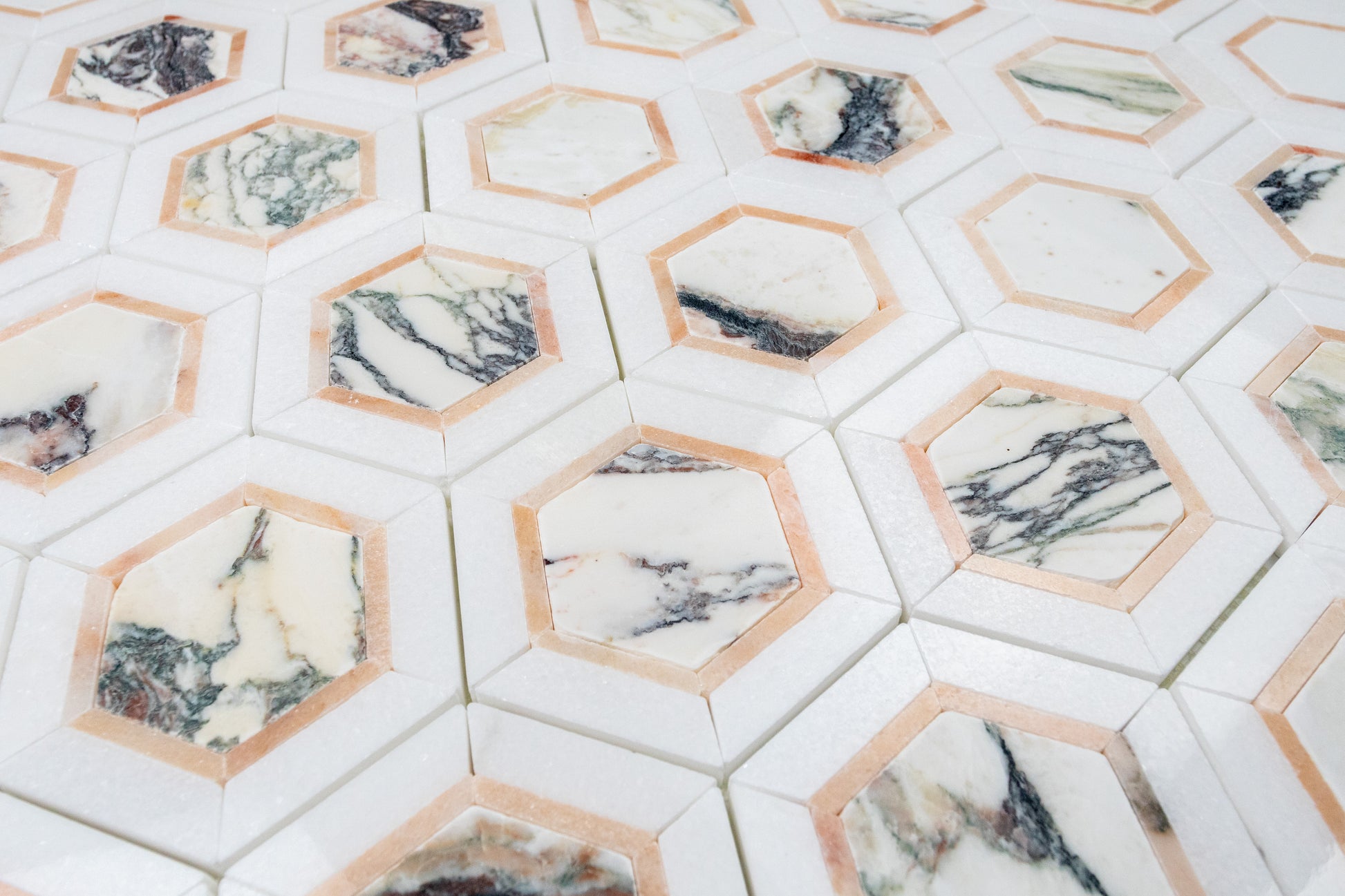 A hexagon in beautiful orange that is sure to grab your attention. Thassos, Rosalba Blend, and paperwhite work great together and can be paired with neutral wood tones or cool whites and greys to create a unique space for any design.