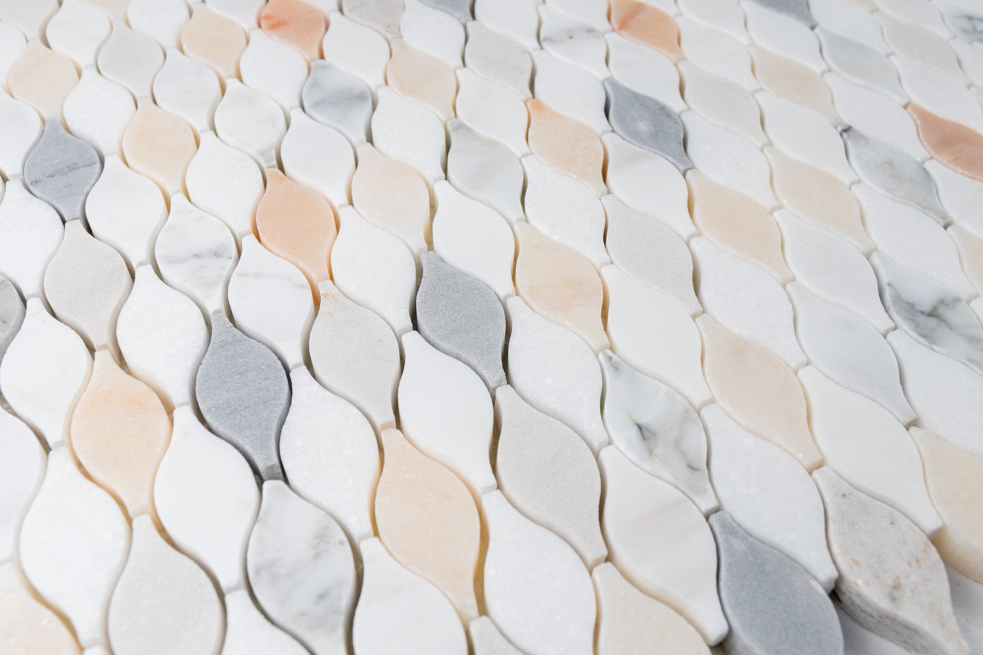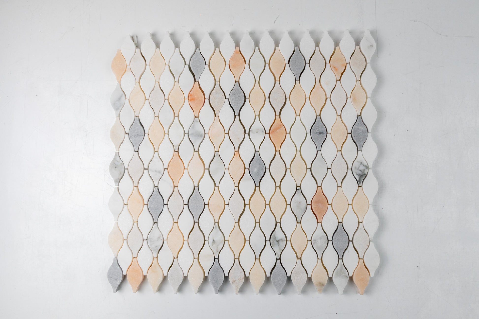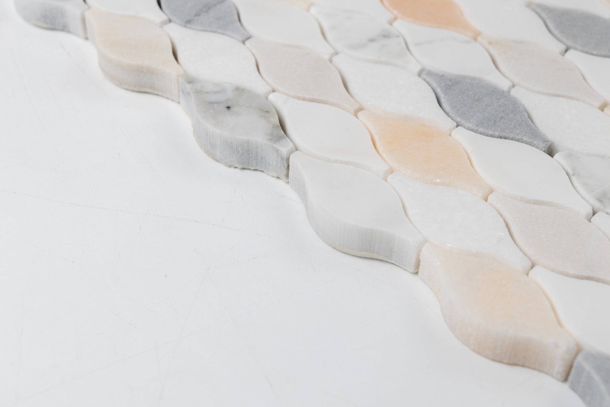 Arabella is a refined marble mosaic that brings soft movement and tailored elegance to walls. The silhouette creates a graceful rhythm that reads both classic and current. Crafted from a curated bland of Thassos, Dolomite, Statuario, Rosalba, and Palisandro, Arabella layers crisp whites, warm neutrals, gentle blush tones, and subtle grey veining for a look that feels collected.