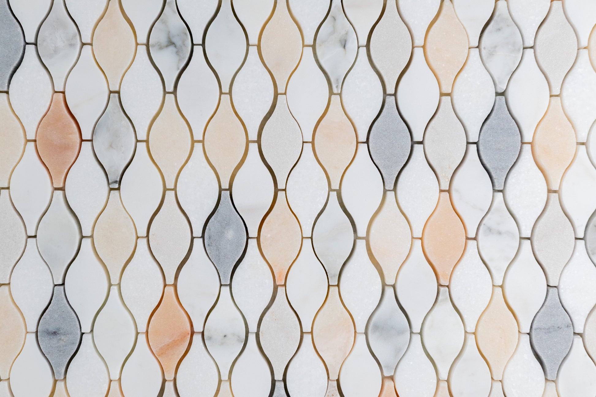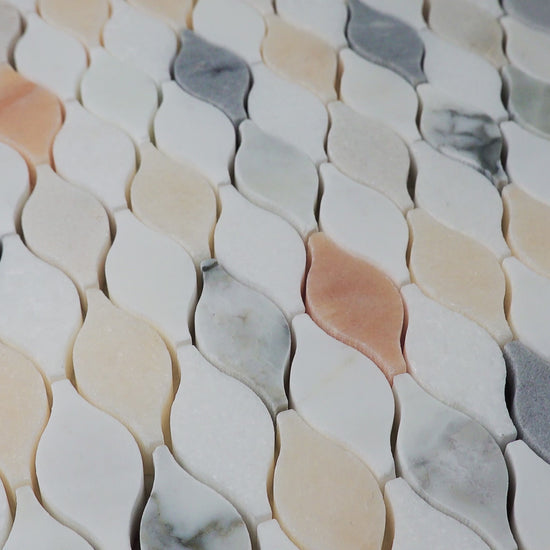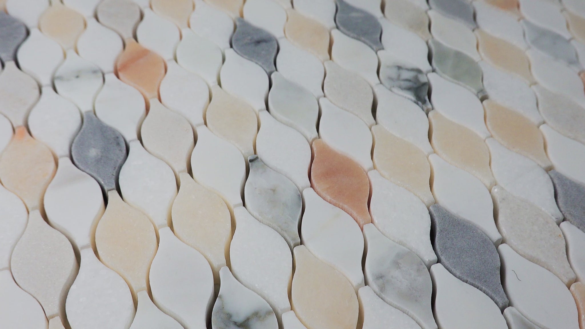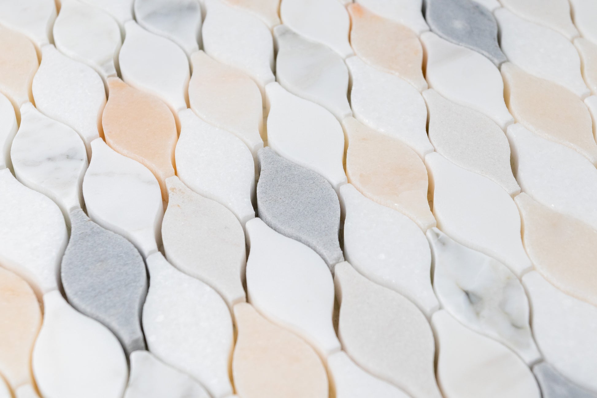 Arabella is a refined marble mosaic that brings soft movement and tailored elegance to walls. The silhouette creates a graceful rhythm that reads both classic and current. Crafted from a curated bland of Thassos, Dolomite, Statuario, Rosalba, and Palisandro, Arabella layers crisp whites, warm neutrals, gentle blush tones, and subtle grey veining for a look that feels collected.