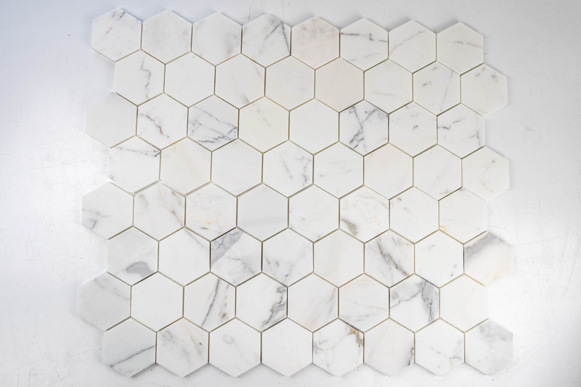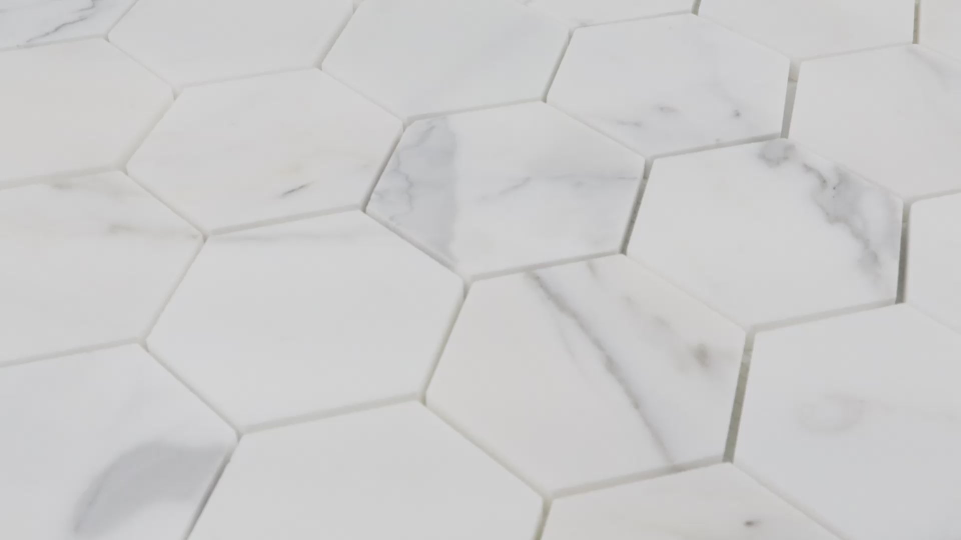 A basic staple in our calacatta collection is our 3" hex. In a honed finish, this is ideal to finish a calacatta bathroom design using this hexagon for the shower floor, niche, or simply by accenting another mosaic.