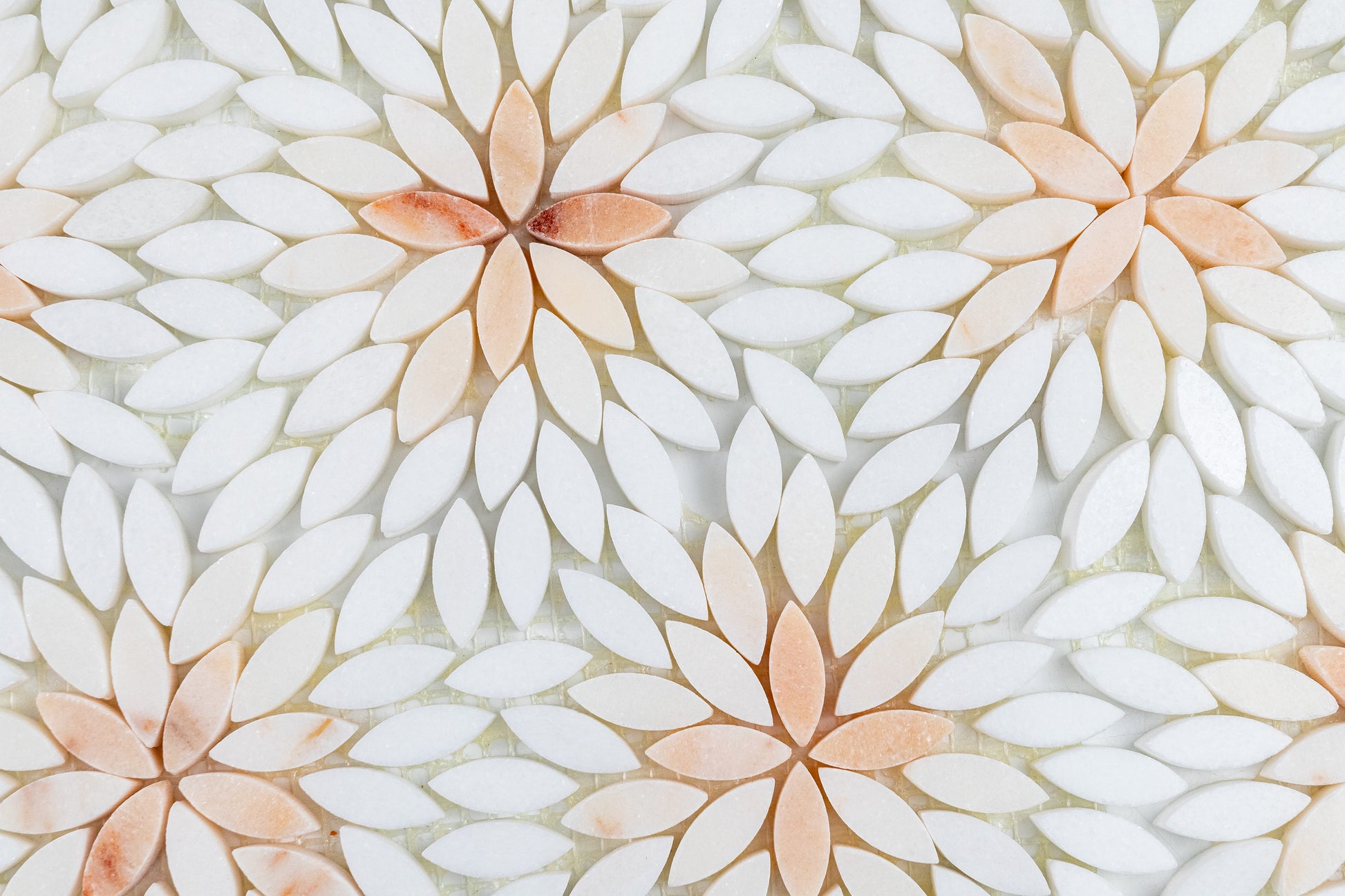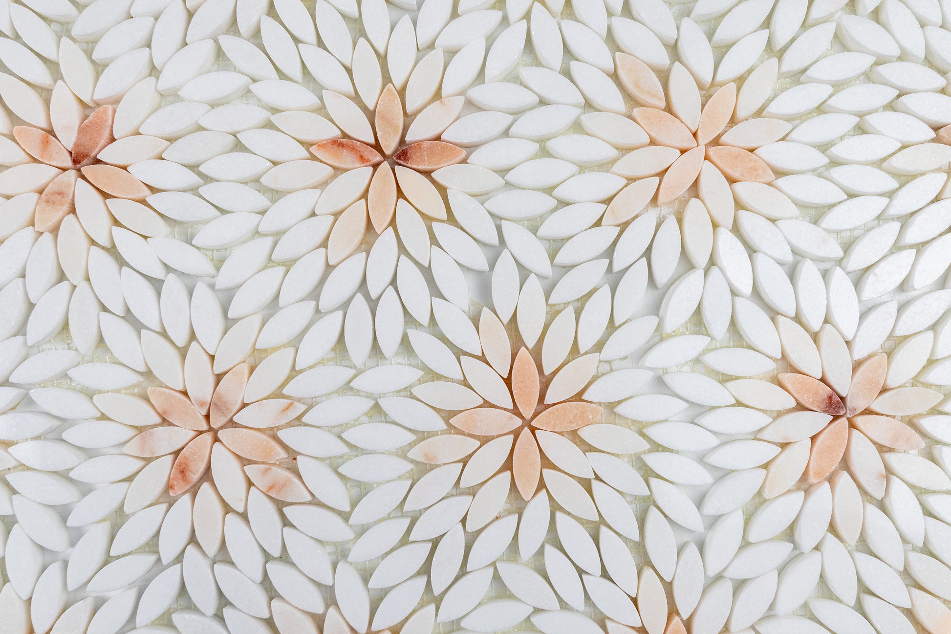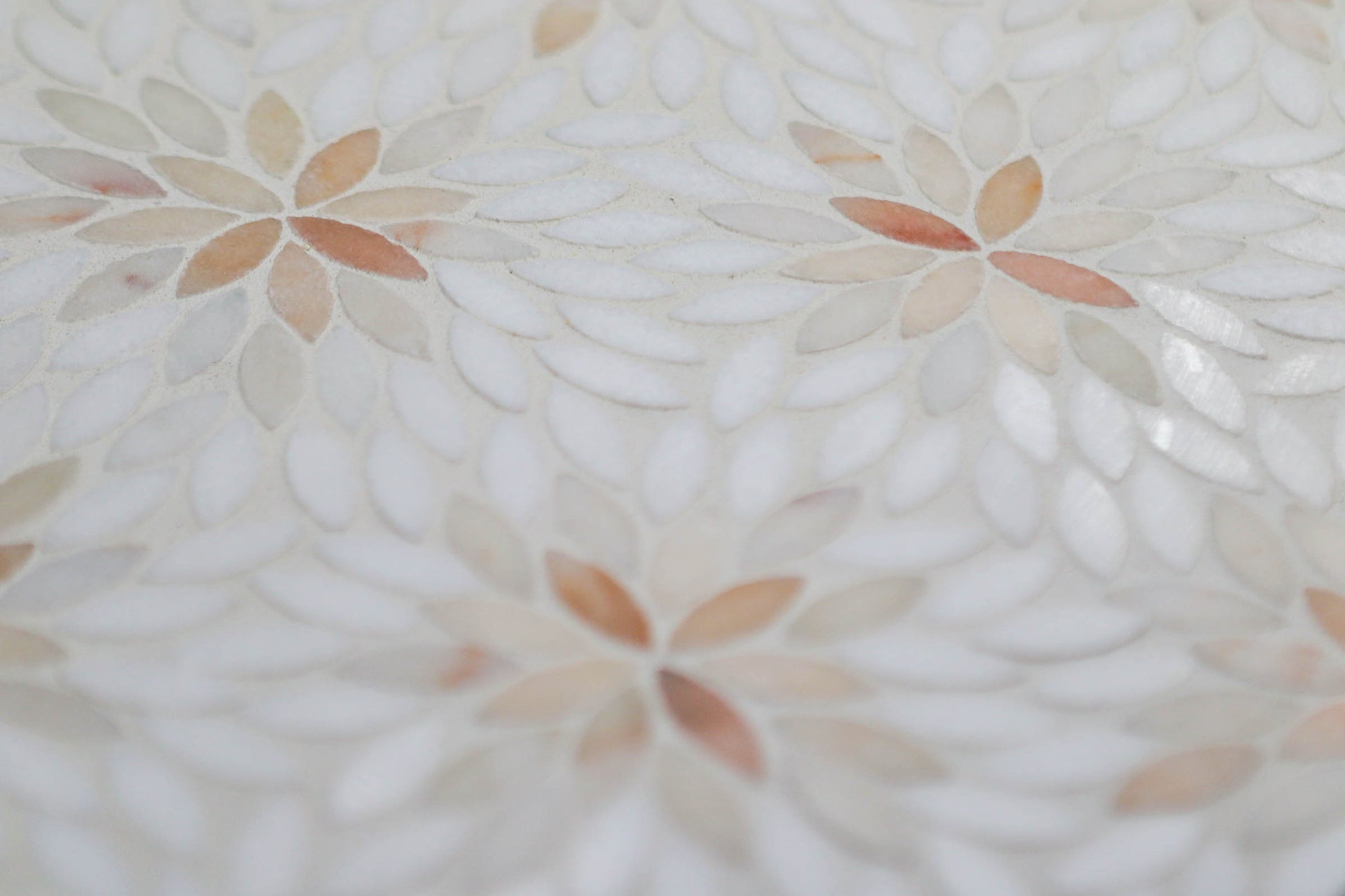 A delicate field of petal motif, Daisy is rendered in our signature Rosalba Blend, an elegant blush toned marble whose soft rose and cream undertones lend the pattern a luminous warmth. The tessellated florals create a gentle cadence across the wall, reading airy from afar and richly detailed up close.