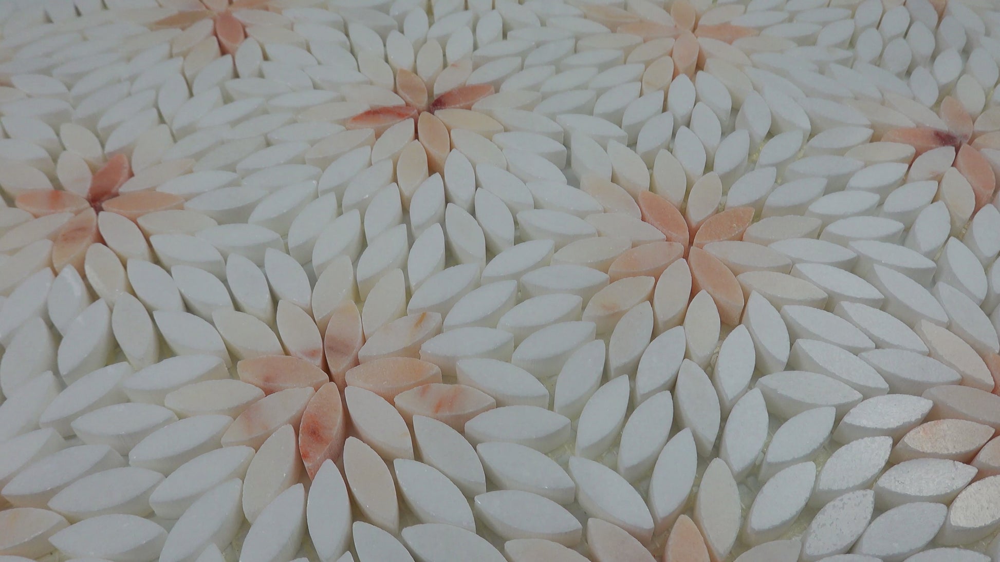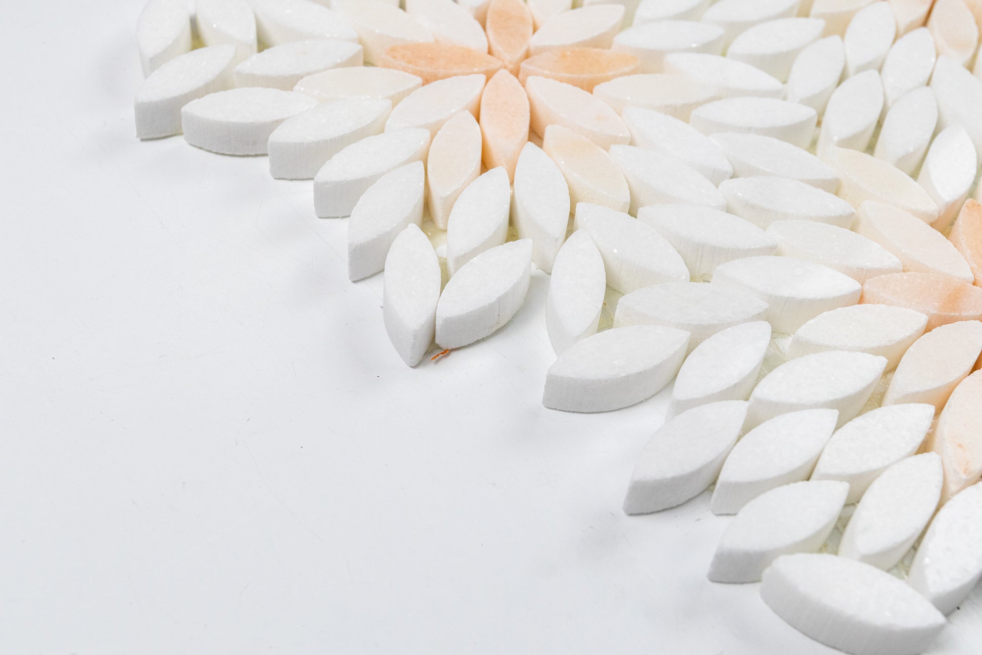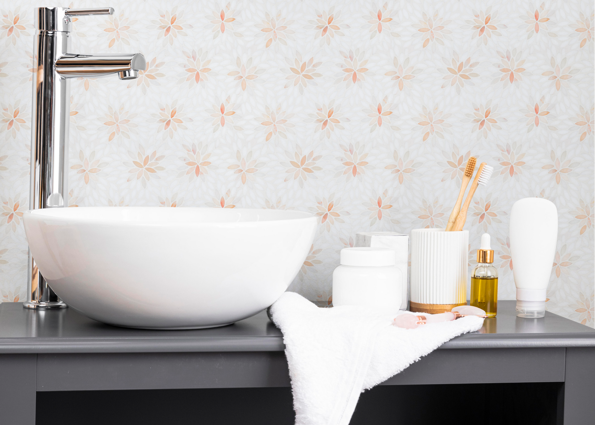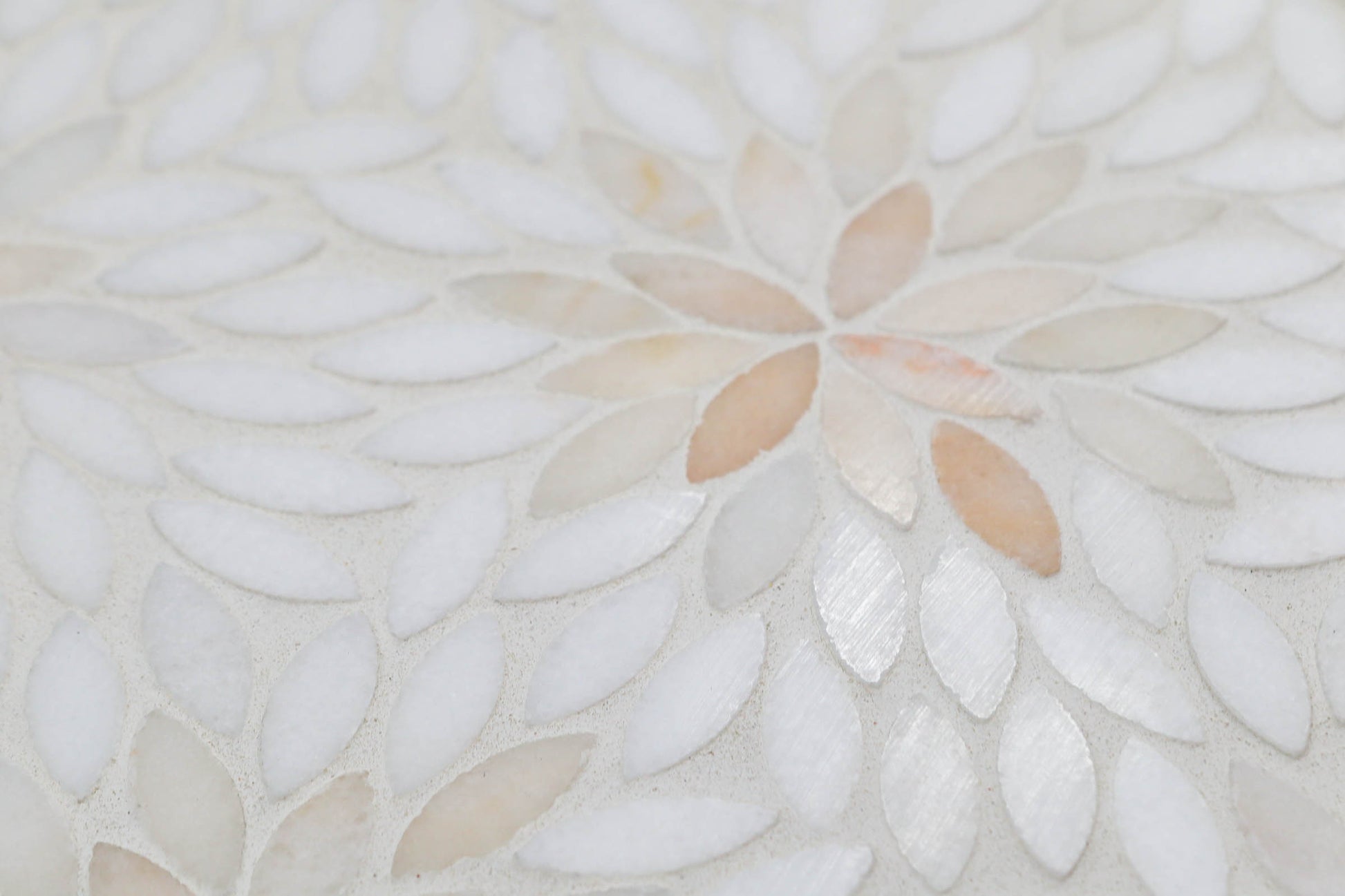 A delicate field of petal motif, Daisy is rendered in our signature Rosalba Blend, an elegant blush toned marble whose soft rose and cream undertones lend the pattern a luminous warmth. The tessellated florals create a gentle cadence across the wall, reading airy from afar and richly detailed up close.