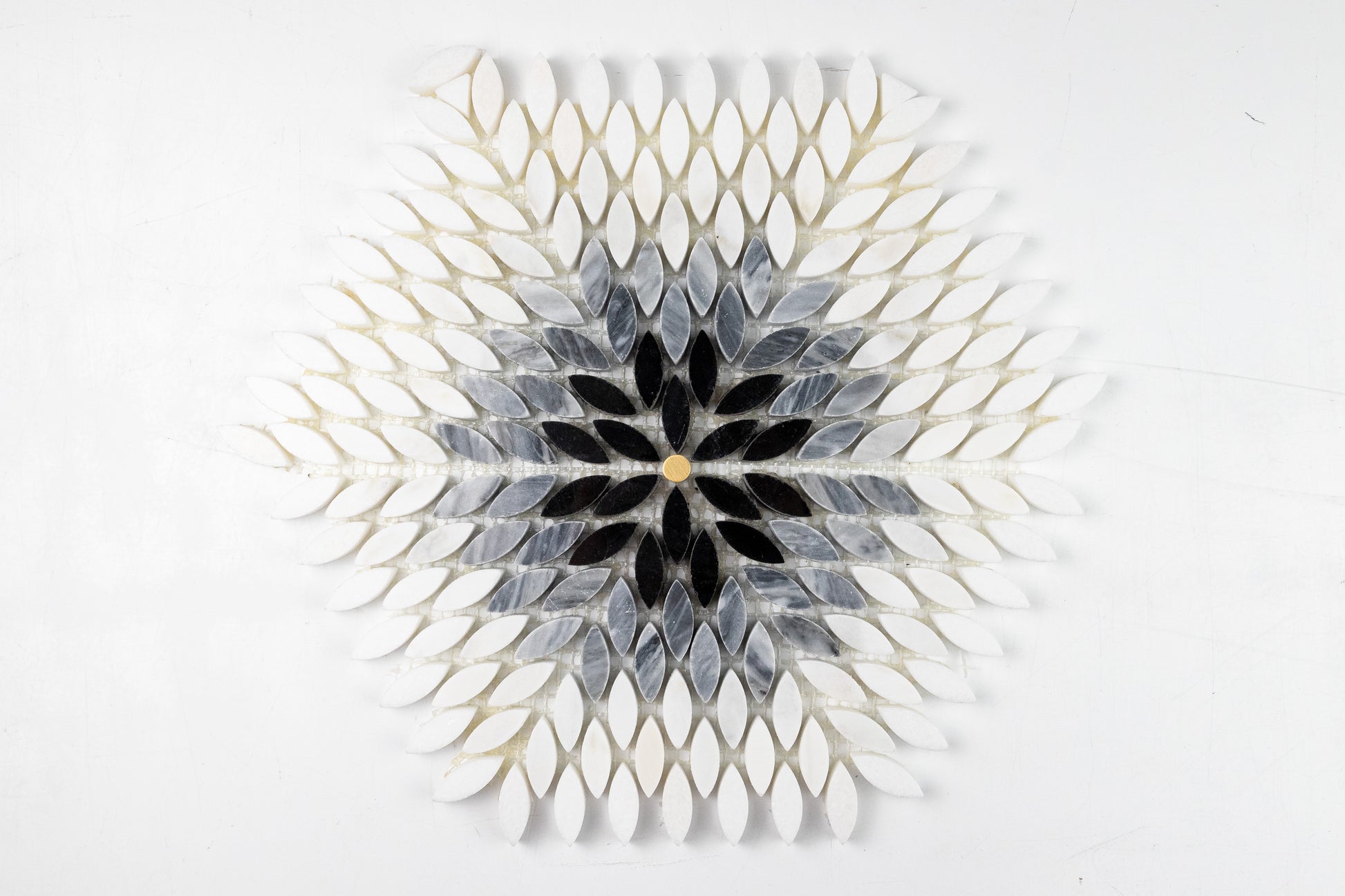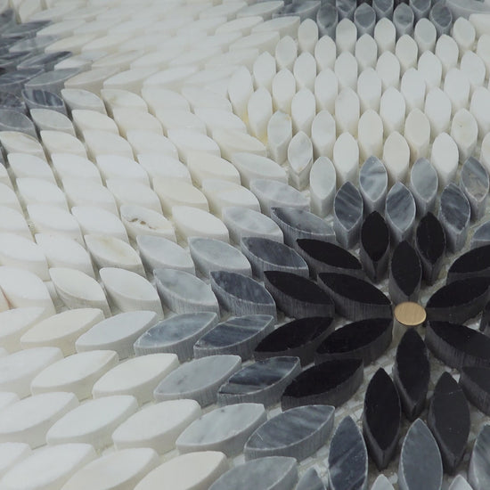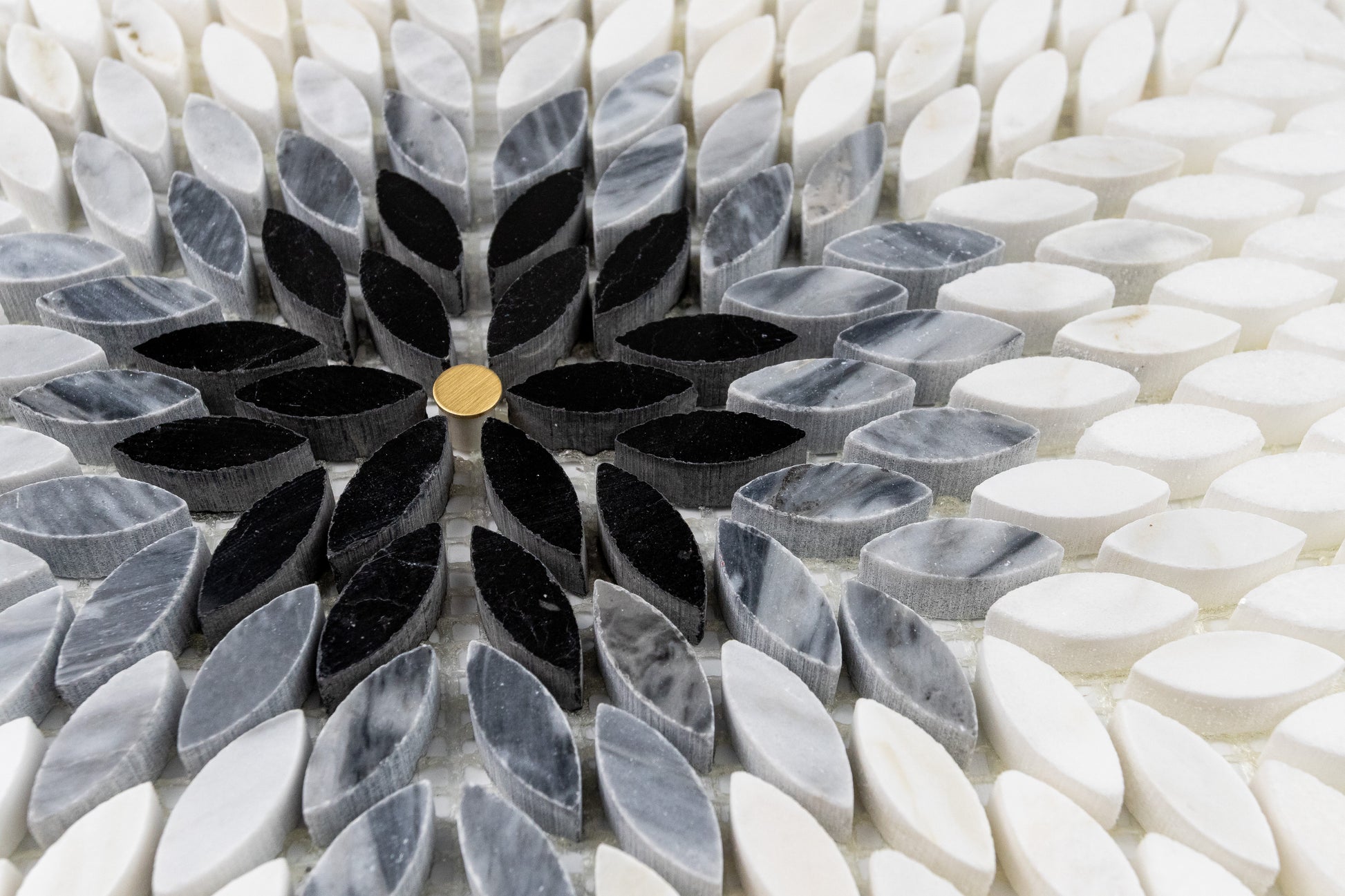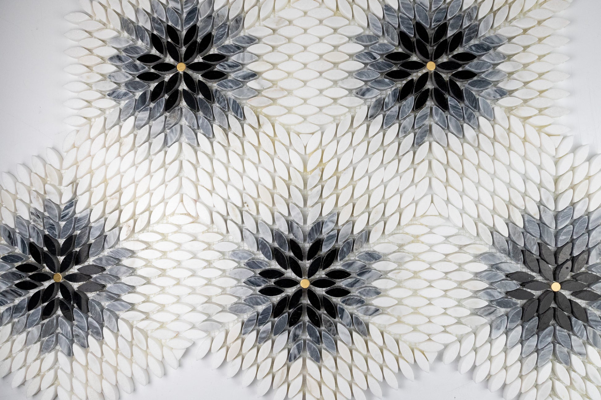 Elevate your space with our exquisite Dimension designed mosaic, a stunning blend of Thassos marble, Calacatta, Nero Marquina, and a touch of brass for a bold yet sophisticated aesthetic. The intricate petal-like pattern creates a mesmerizing sense of depth and movement.