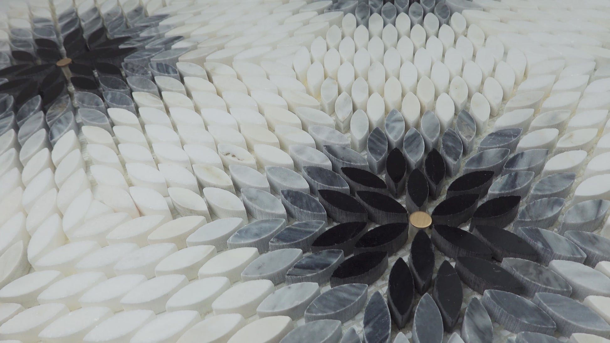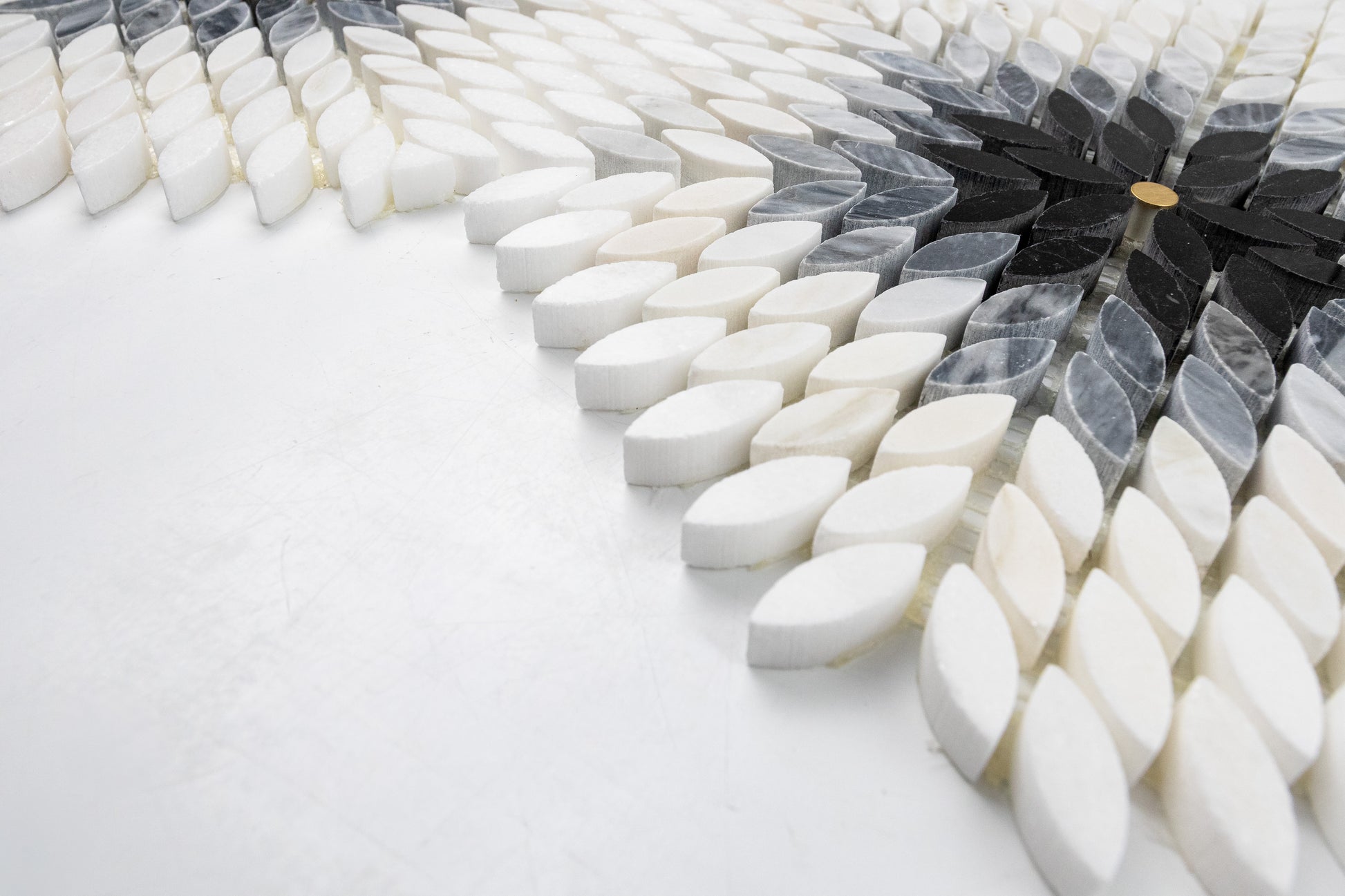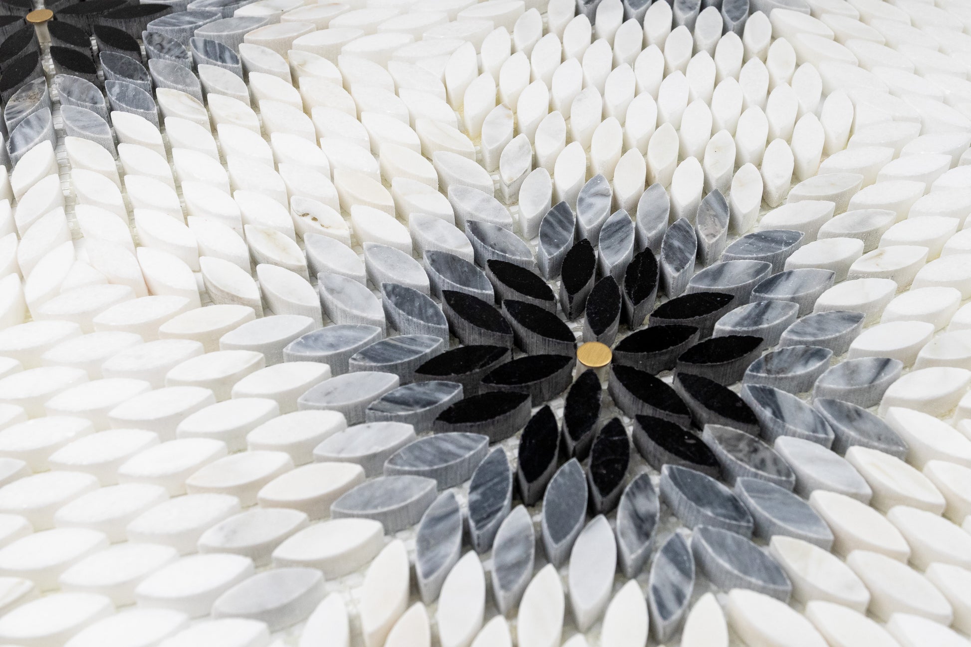 Elevate your space with our exquisite Dimension designed mosaic, a stunning blend of Thassos marble, Calacatta, Nero Marquina, and a touch of brass for a bold yet sophisticated aesthetic. The intricate petal-like pattern creates a mesmerizing sense of depth and movement.