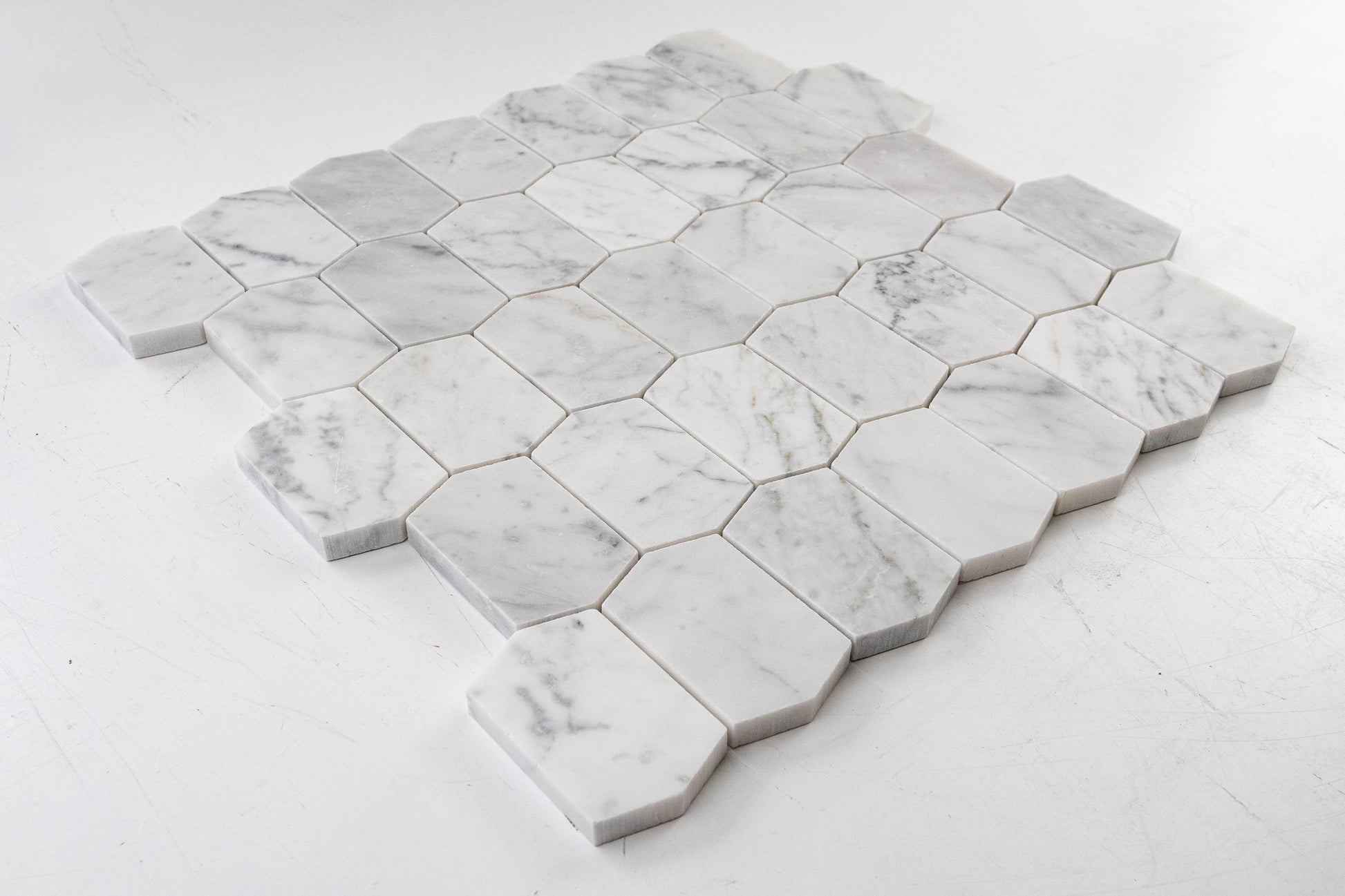 A timeless staple for Stonebridge is our elongated hexagon available in carrara or calacatta. This is our go to shower floor mosaic is you are looking for a clean look. The elongated shape offers a different look than the traditional hex.