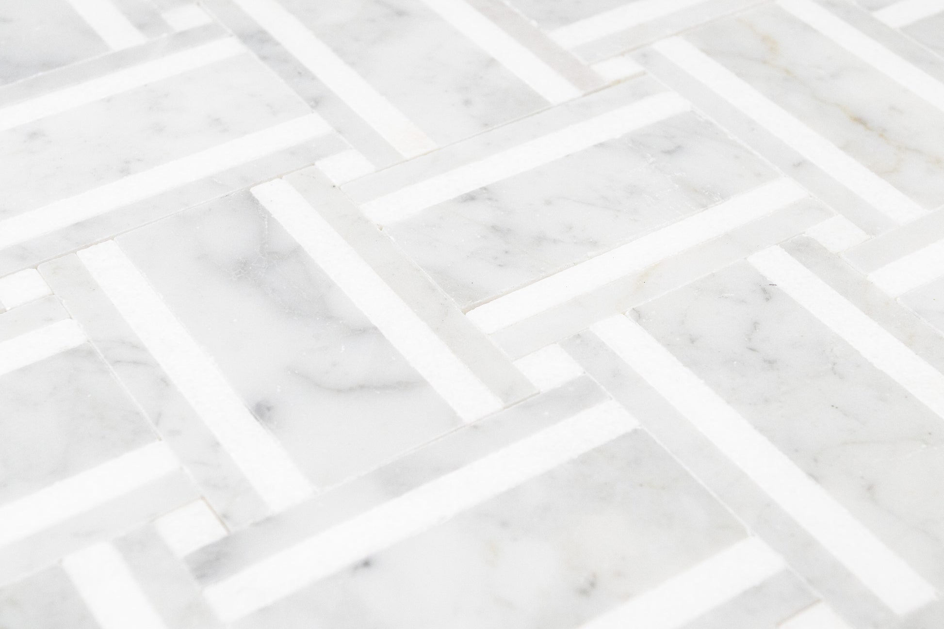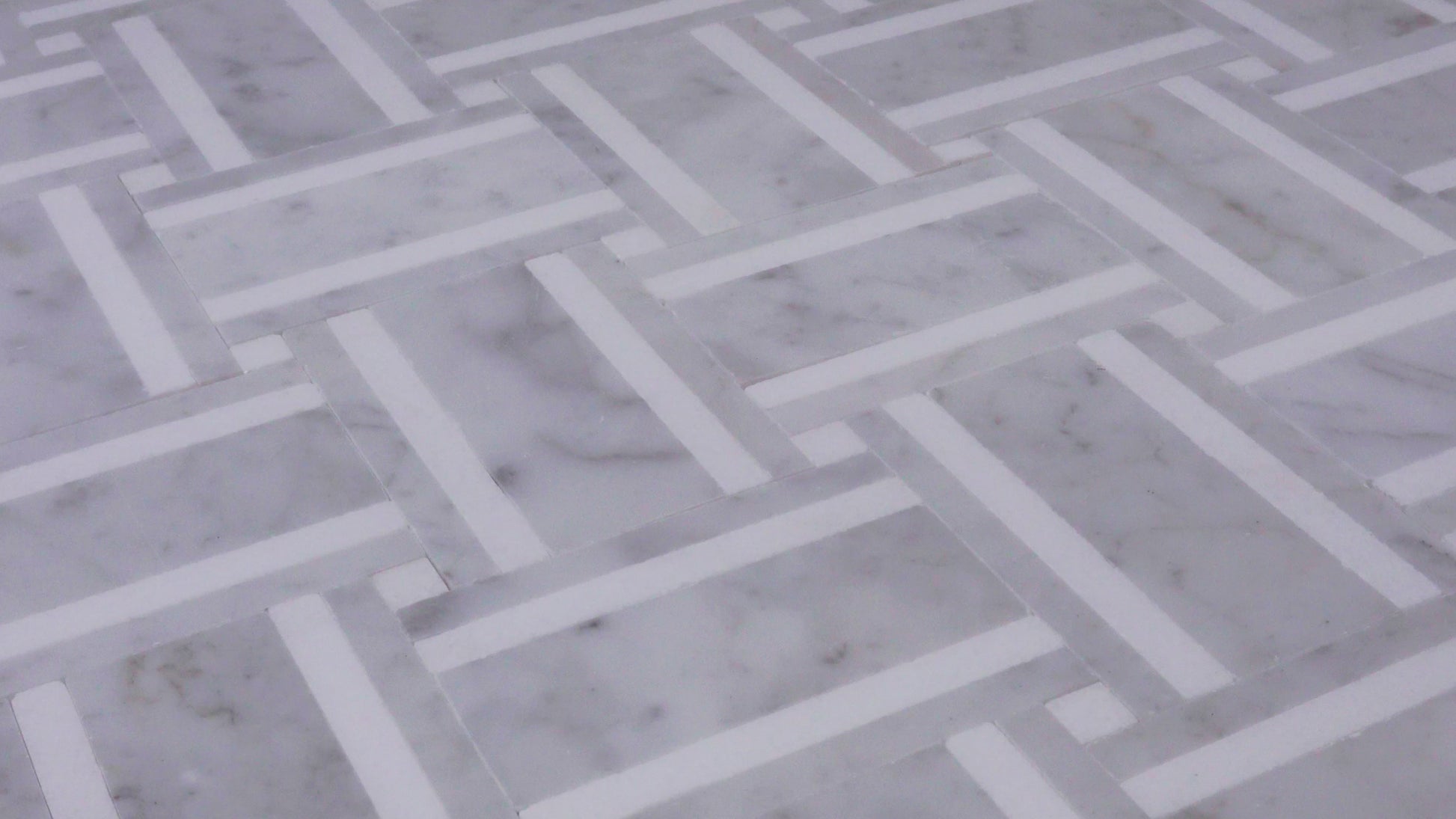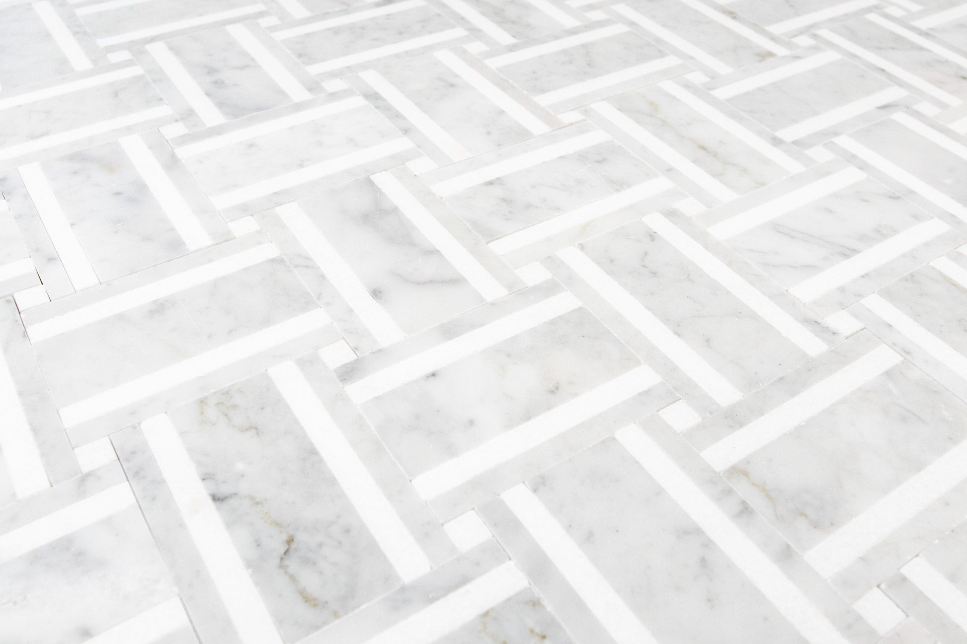 A tailored basketweave rendered in luminous Italian Carrara and accented with crisp Thassos strips, Grand Bacon brings architectural rhythm and quiet luxury to any room. The soft, dove gray veining of Carrara is sharpened by the clean white linear inlays, creating a refined play of light and shadow across the surface. Precision water-jet pieces and tight joints produce a seamless field that feels both modern and timeless.