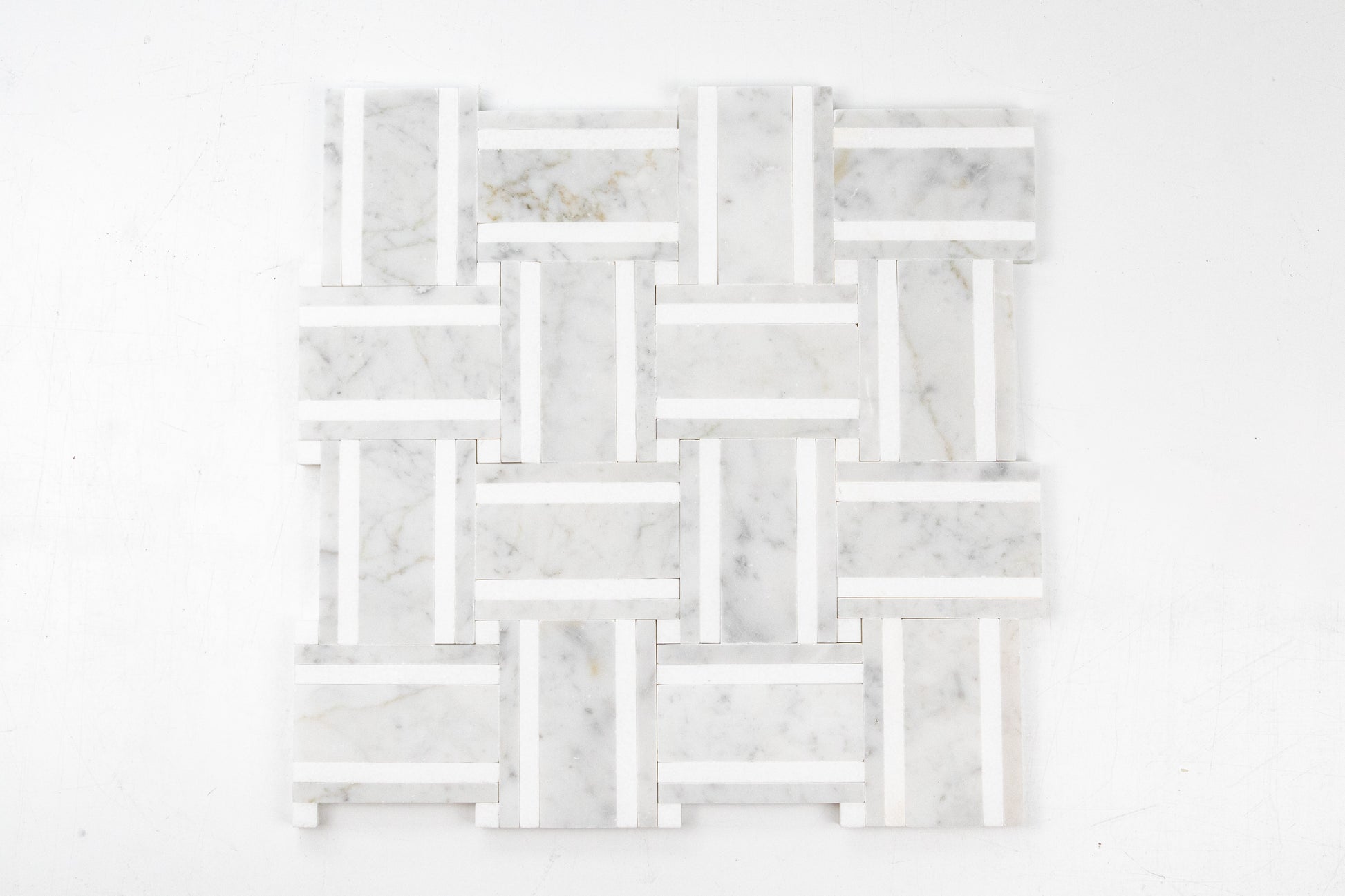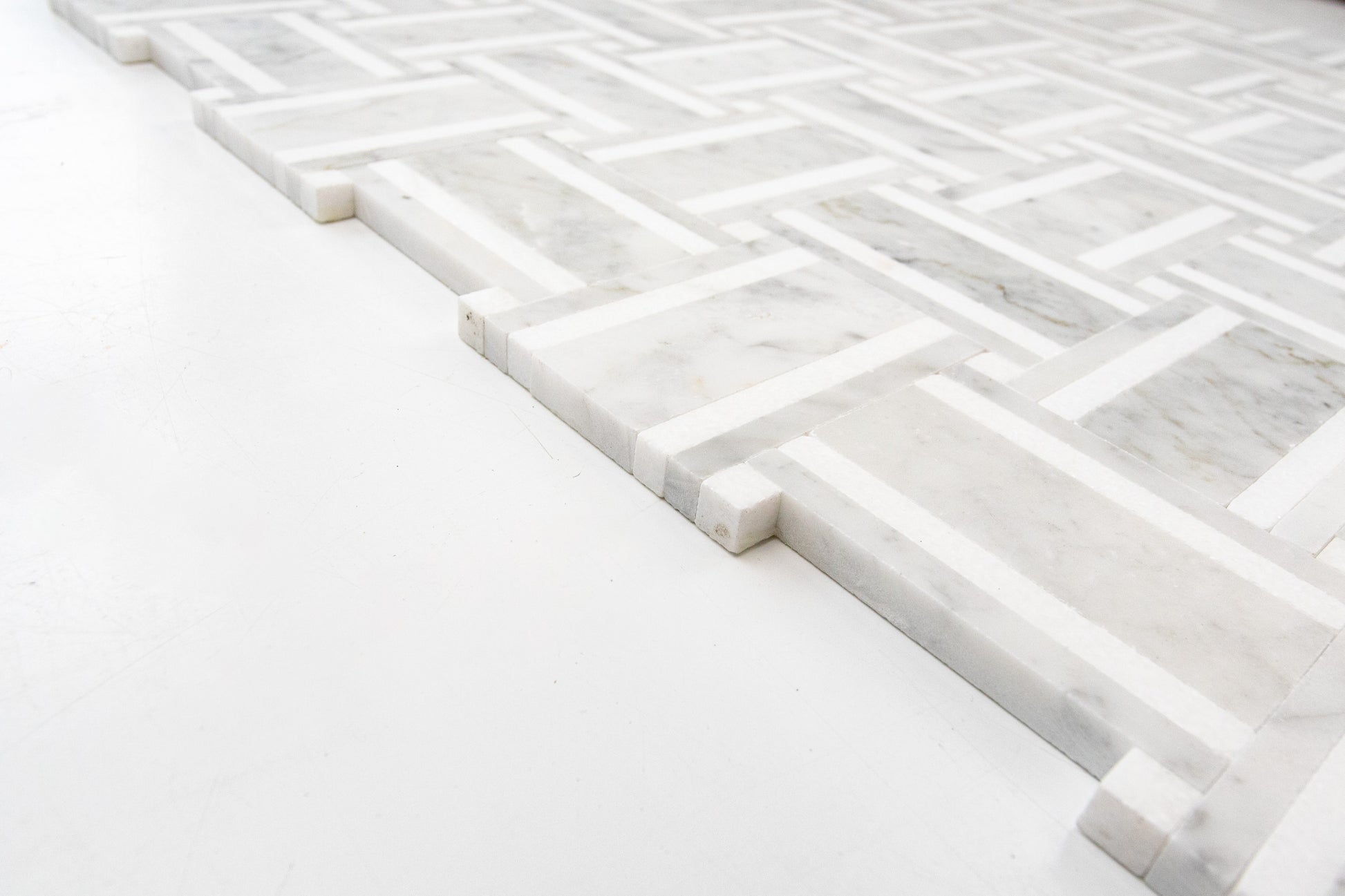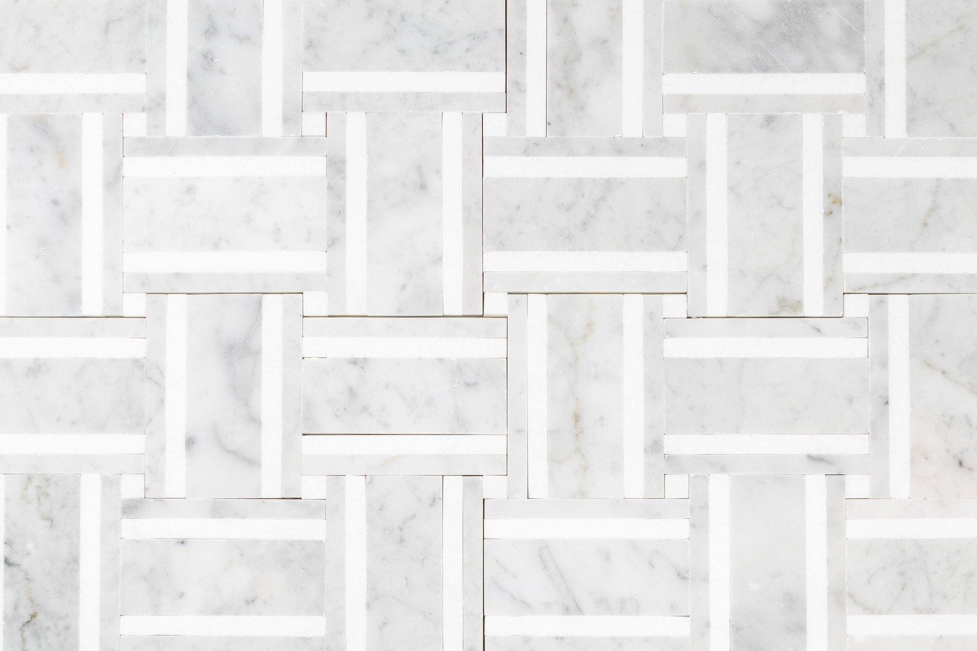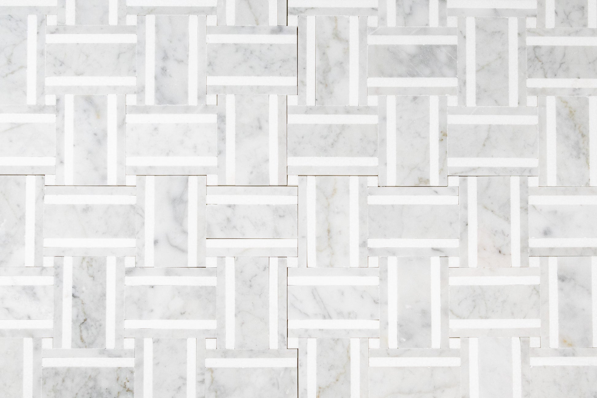 A tailored basketweave rendered in luminous Italian Carrara and accented with crisp Thassos strips, Grand Bacon brings architectural rhythm and quiet luxury to any room. The soft, dove gray veining of Carrara is sharpened by the clean white linear inlays, creating a refined play of light and shadow across the surface. Precision water-jet pieces and tight joints produce a seamless field that feels both modern and timeless.