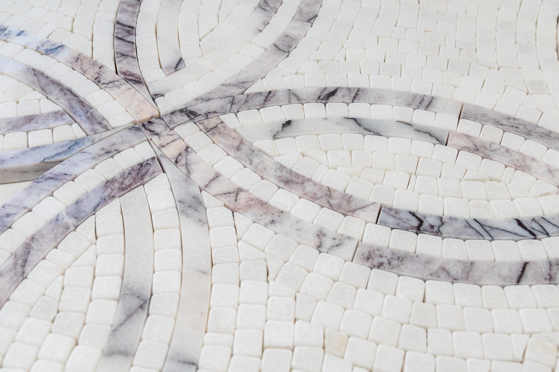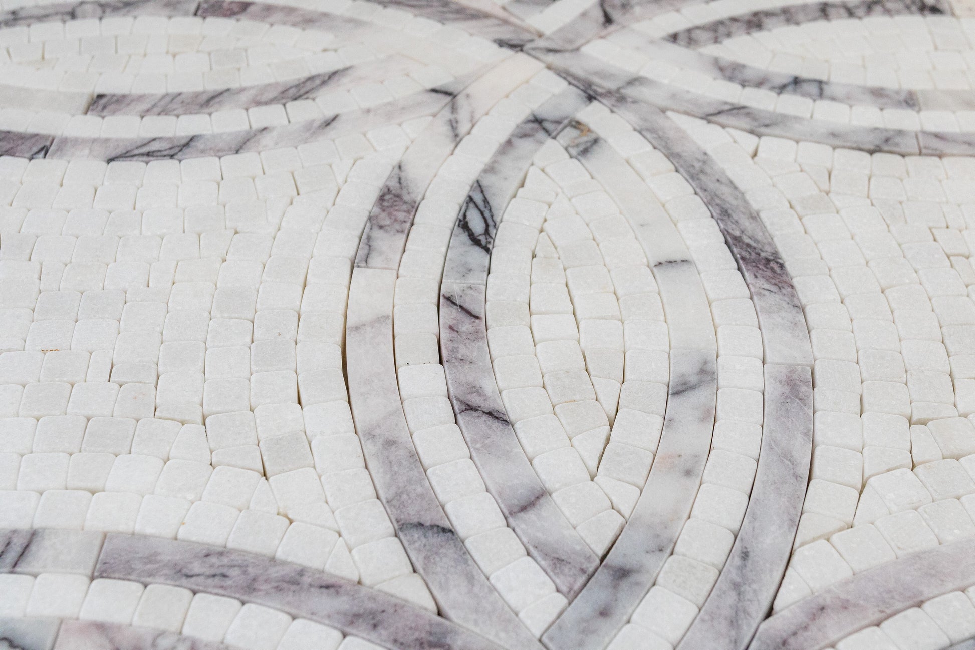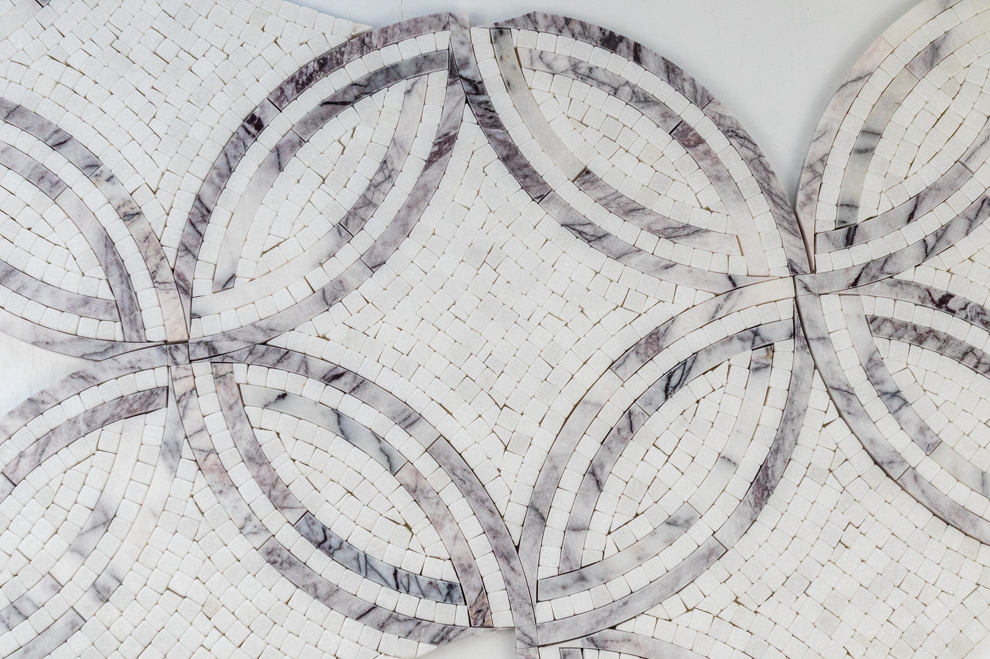 Our Santorini Waterjet will transport you right into Greece with the soft tumbled white Thassos and Lilac polished lines. The Thassos and Lilac color way is stocked but feel free to be creative and customize this mosaic to your design. All Waterjet patterns are available for customization, allowing you to tailor stones, colors, materials, and finishes to match your unique vision.