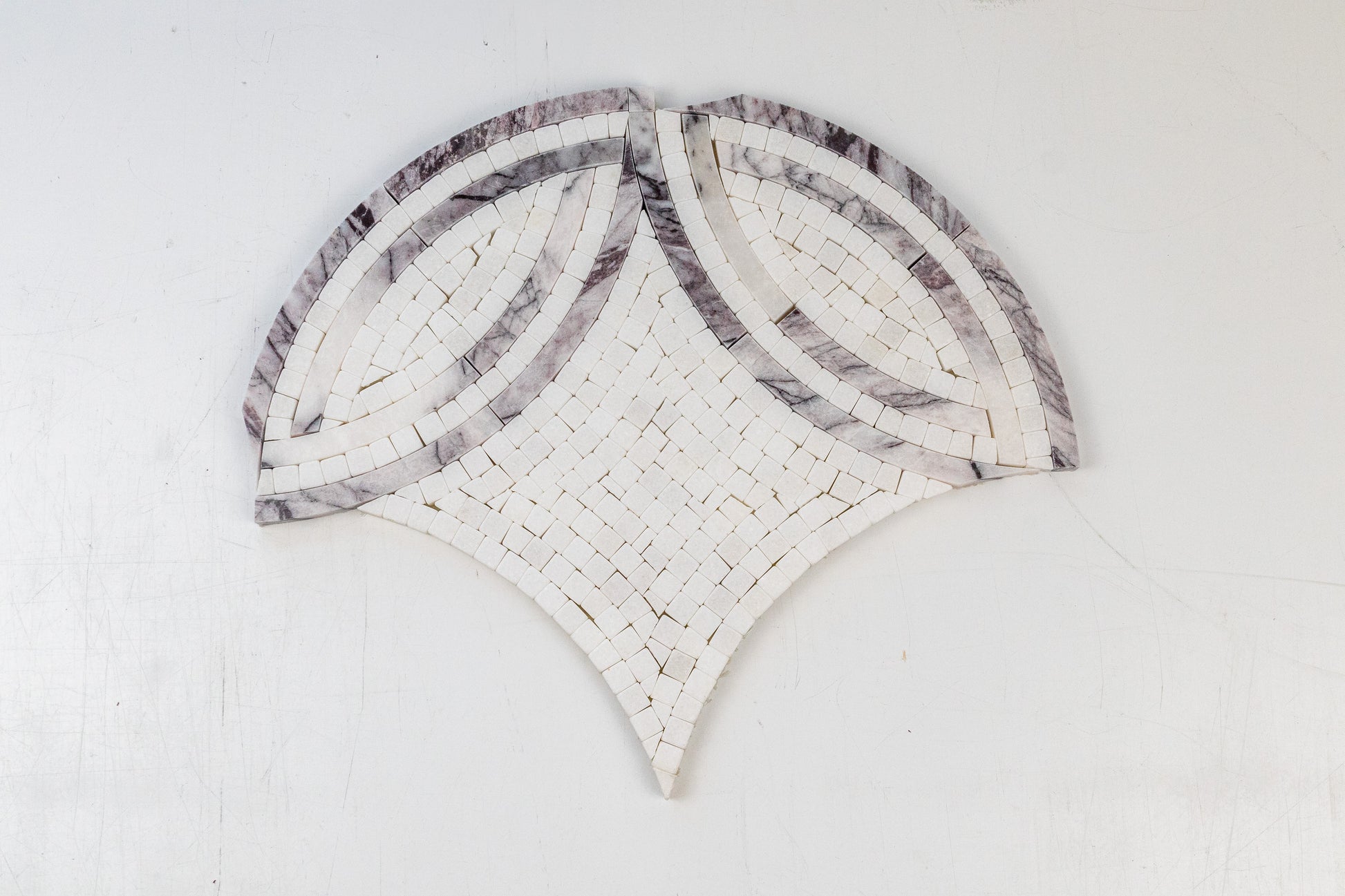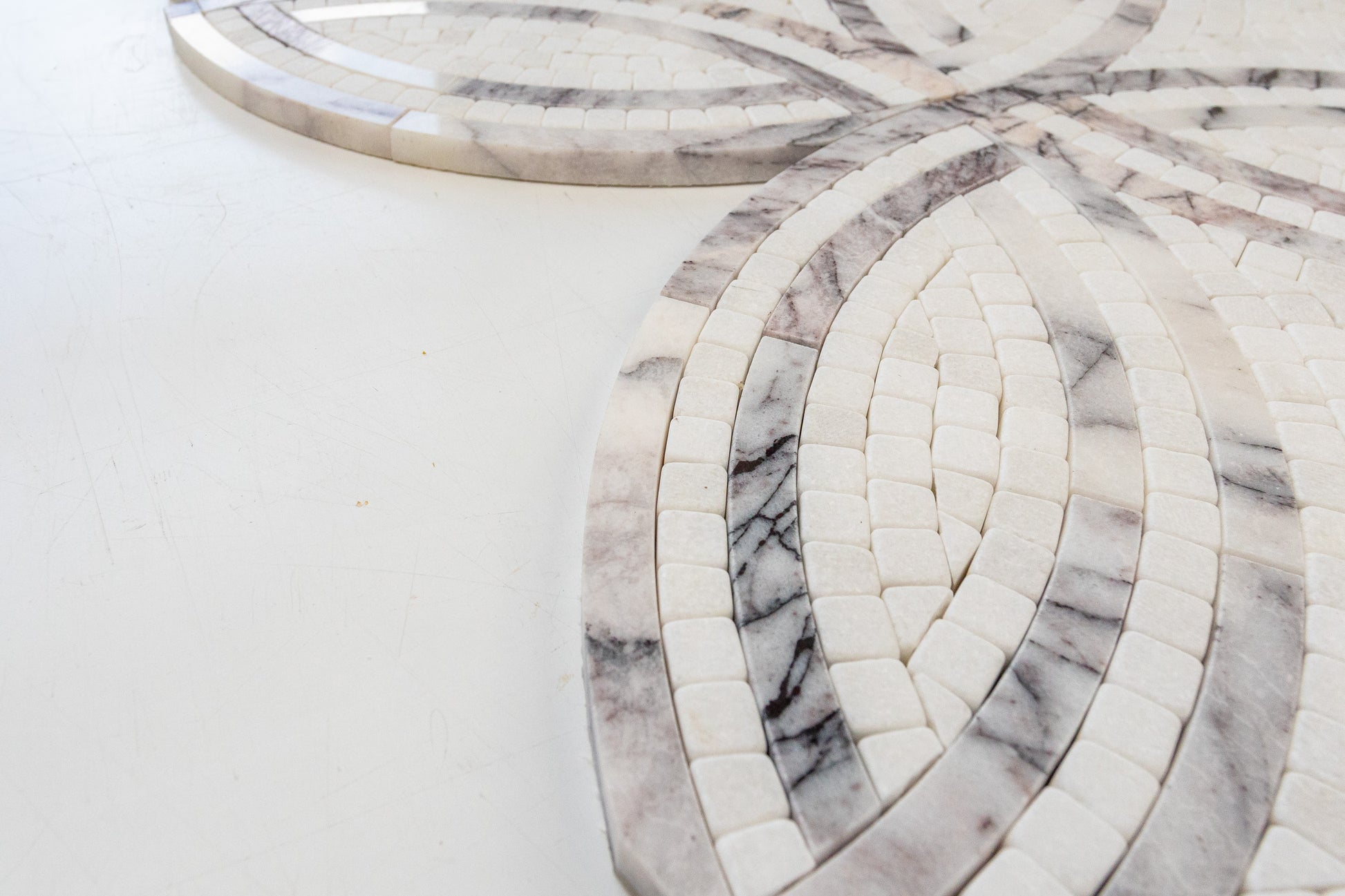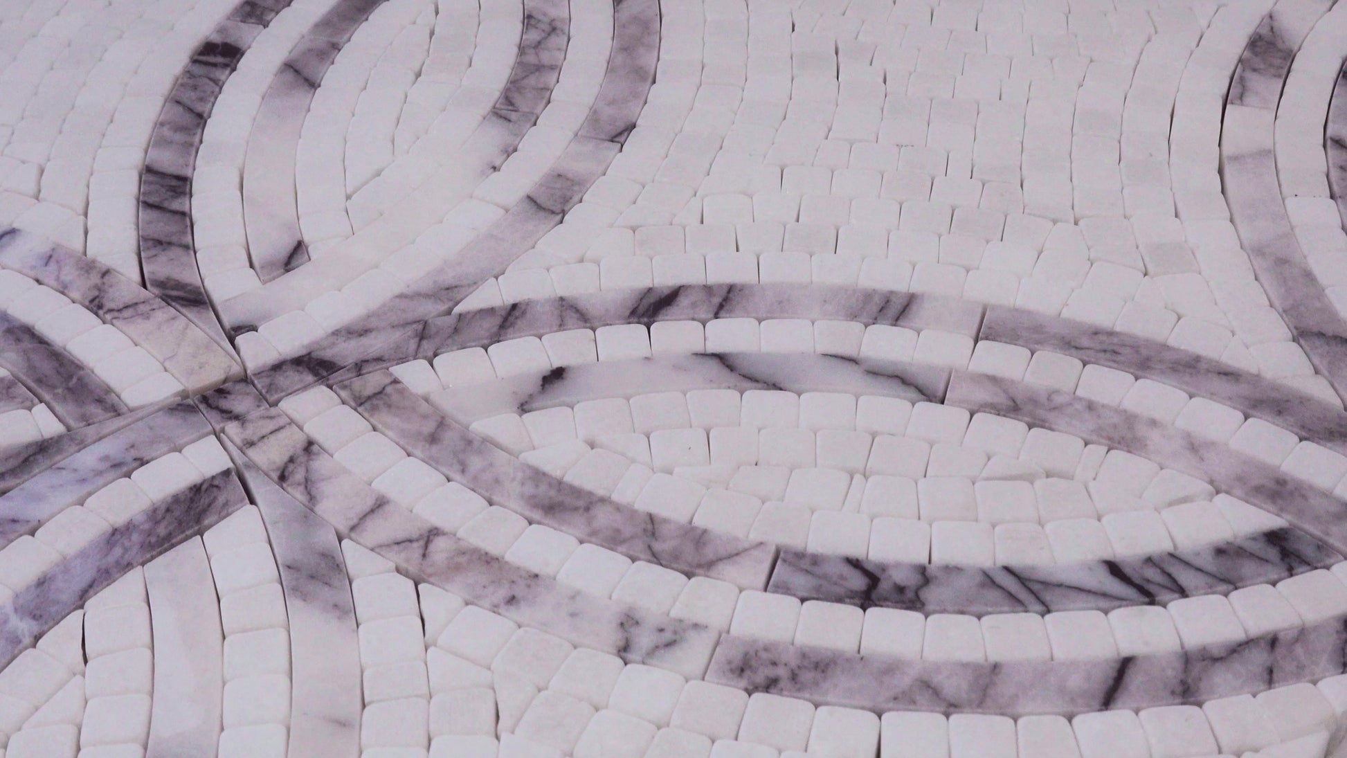 Our Santorini Waterjet will transport you right into Greece with the soft tumbled white Thassos and Lilac polished lines. The Thassos and Lilac color way is stocked but feel free to be creative and customize this mosaic to your design. All Waterjet patterns are available for customization, allowing you to tailor stones, colors, materials, and finishes to match your unique vision.
