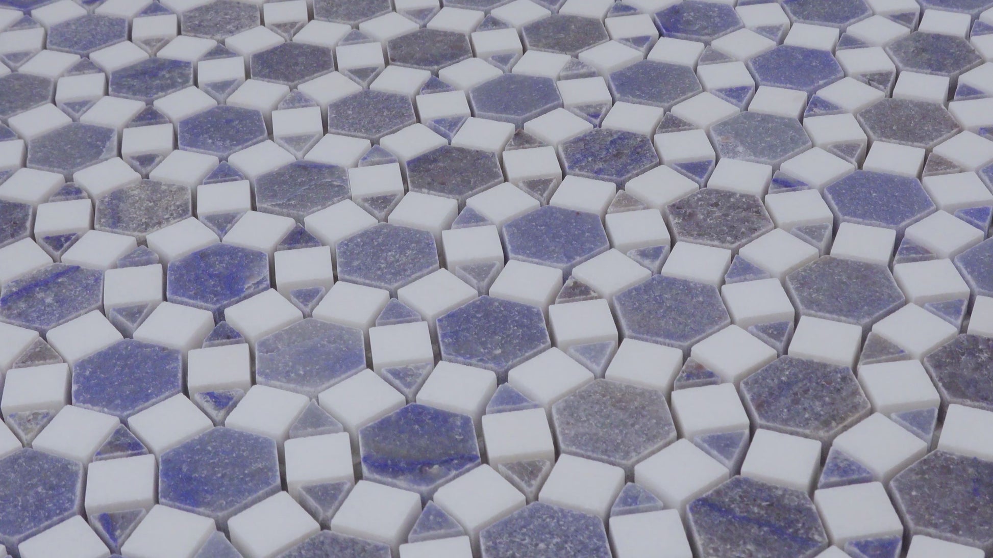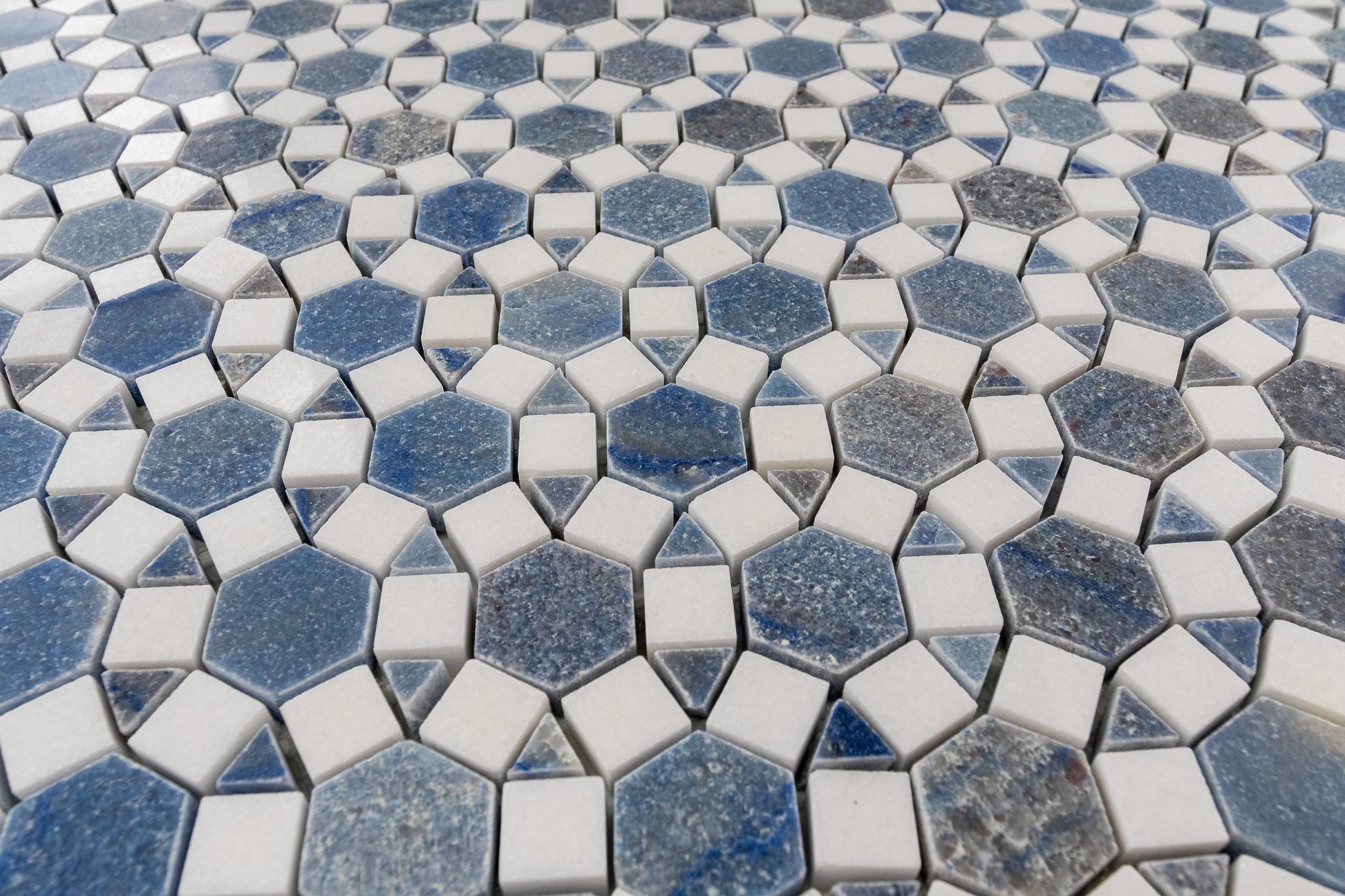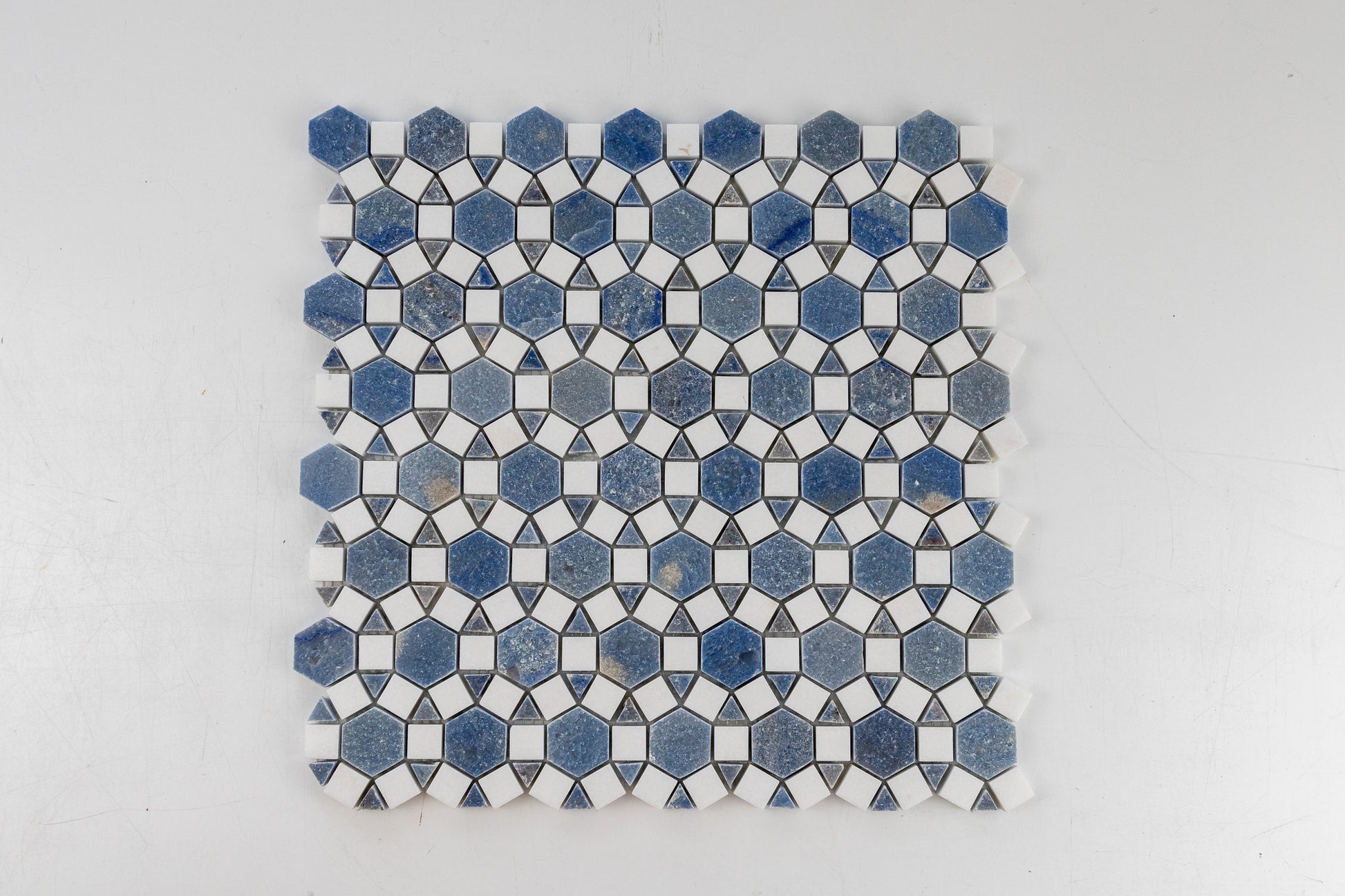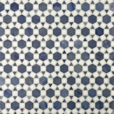 Timeless sunflower pattern from Stonebridge. A different take on a hexagon, this mosaics is offered in two different colorways perfect for shower floors, secondary baths and even laundry rooms.