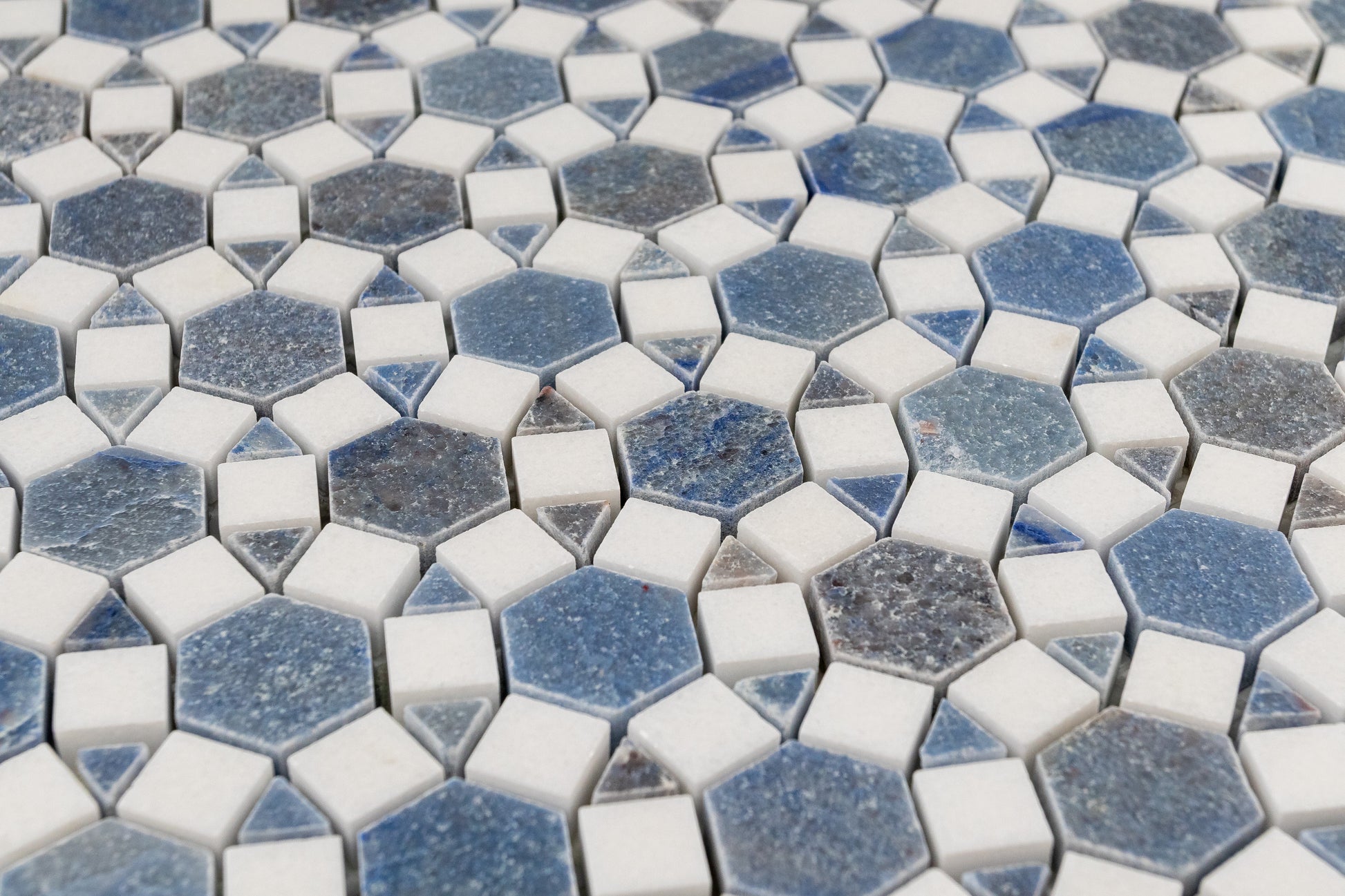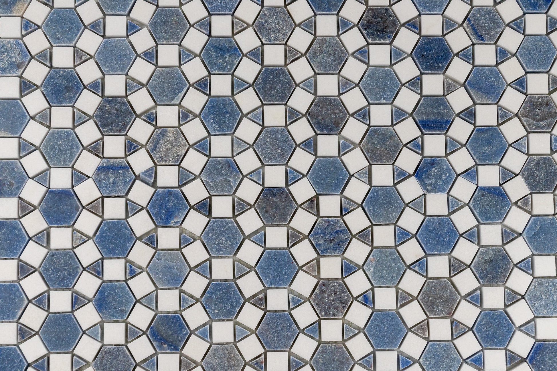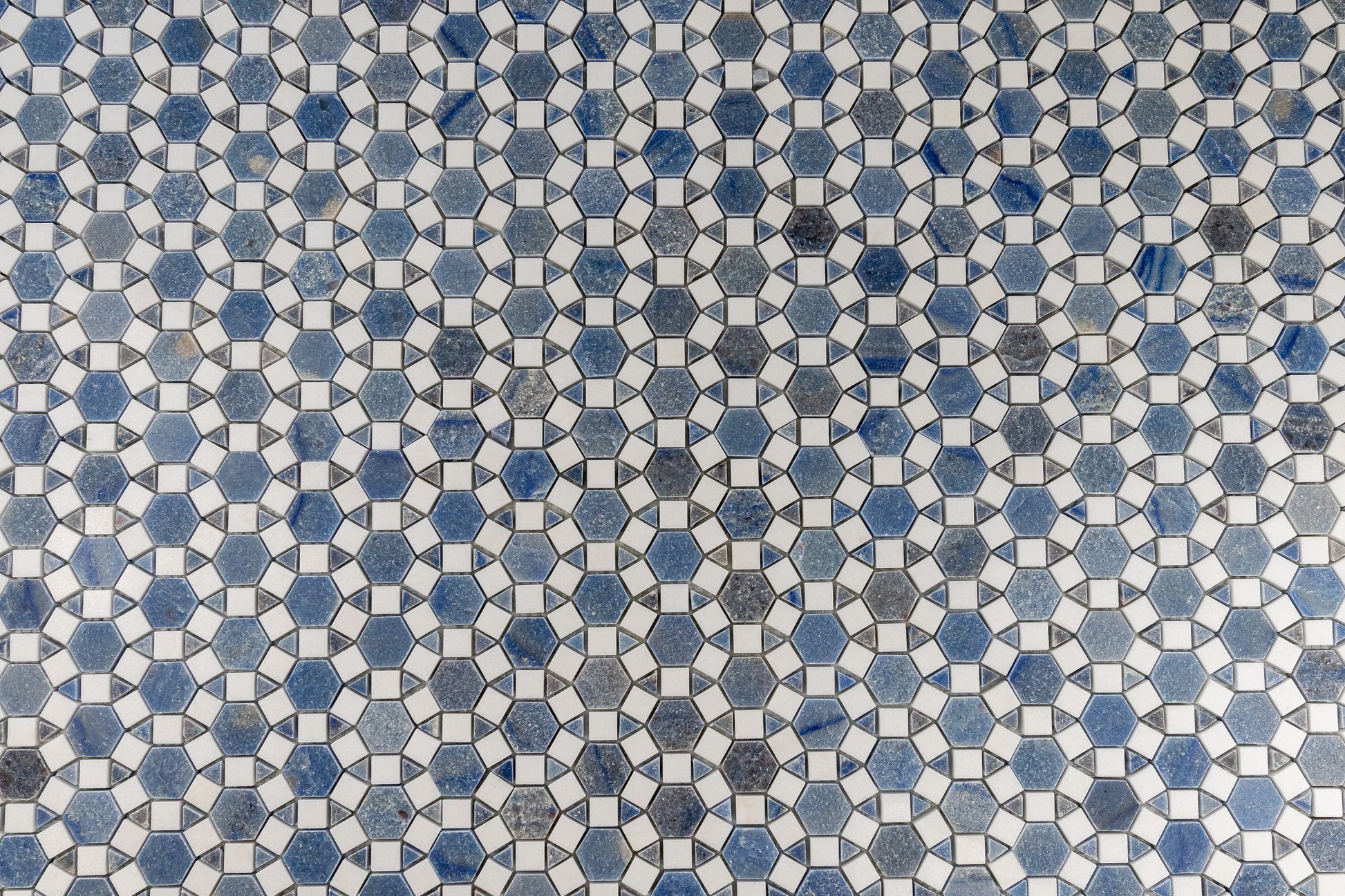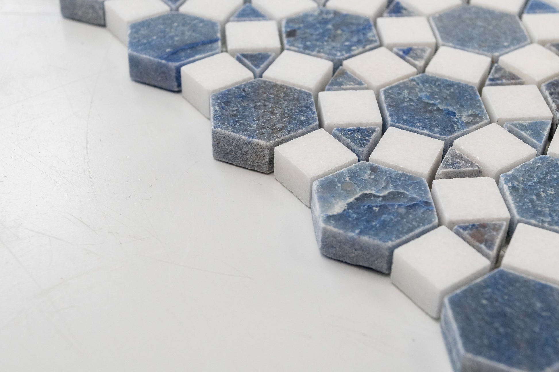 A luminous study in geometry and contrast, Sunflower pairs the ocean-toned depth of Azul Macauba with the pristine brilliance of Thassos marble. Faceted octagons and crisp white accents create a refined, rhythmic bloom that feels both timeless and modern. The result is an elegant statement surface with unmistakable luxury and enduring sophistication.