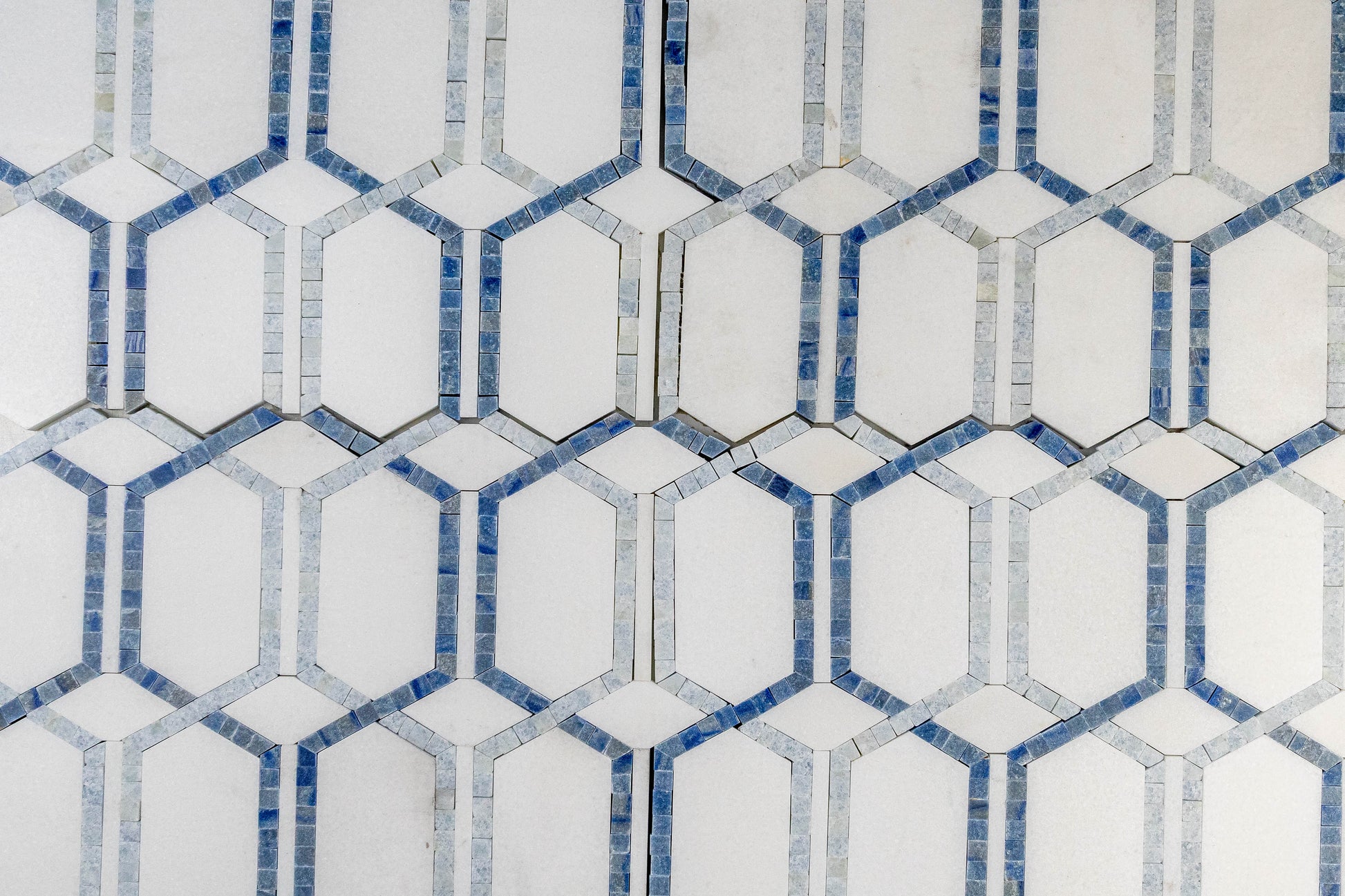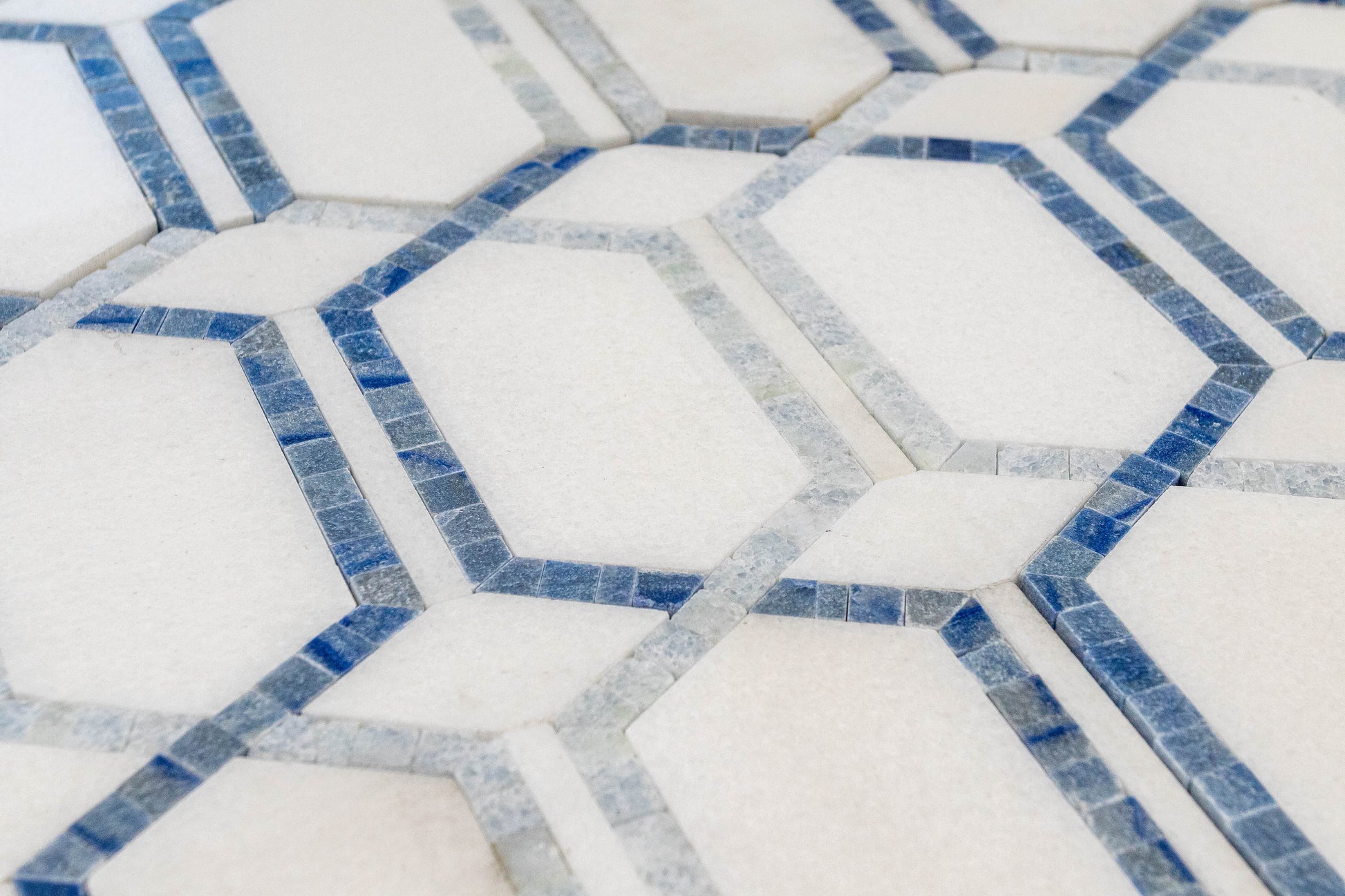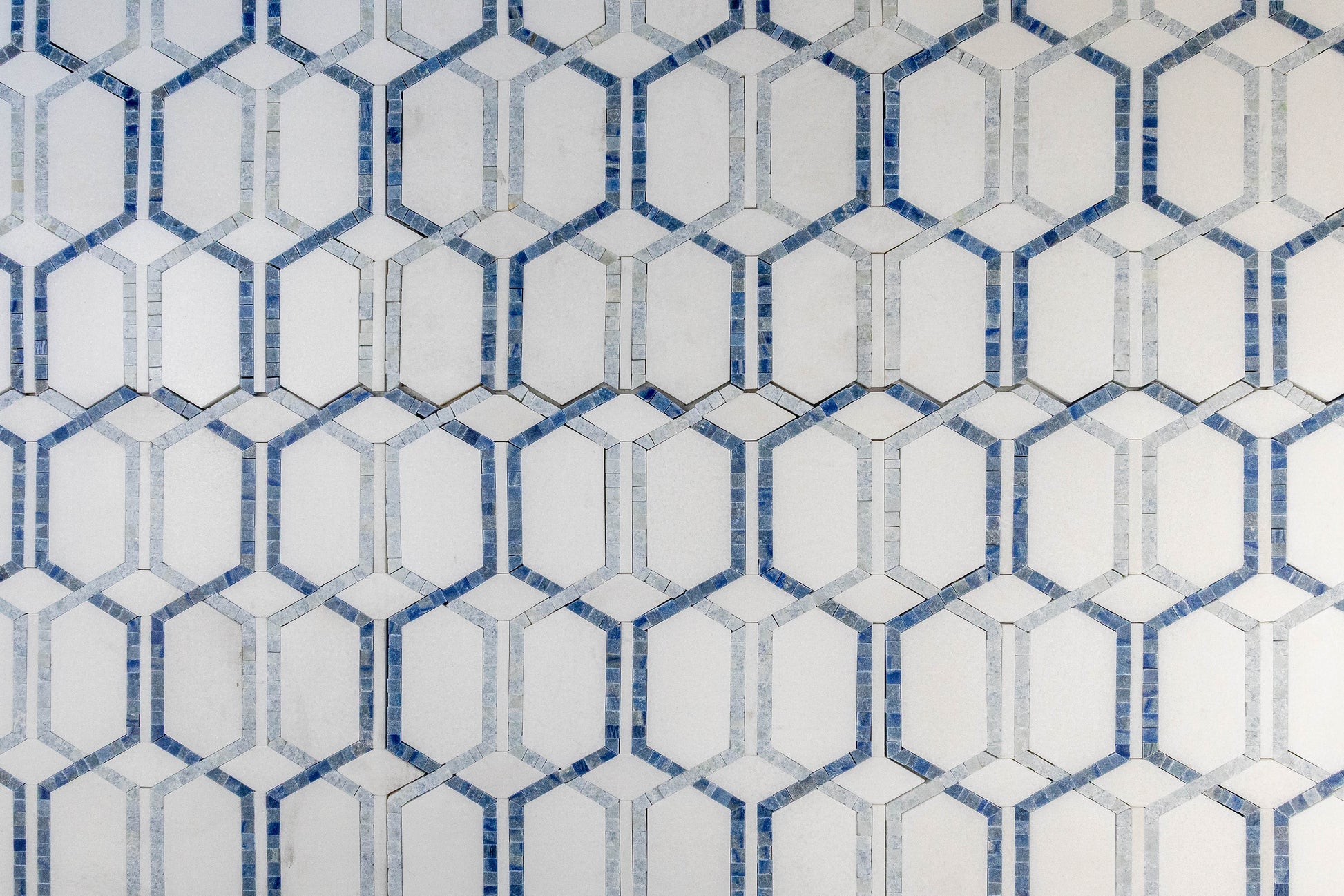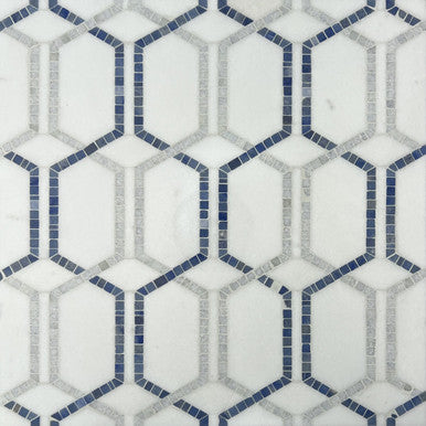 Bring a breeze of coastal elegance to the kitchen with Tahiti. Luminous Thassos anchors the design while soft Blue Celeste and the ocean-deep striations of Azul Macaubas trace a refined, elongated hex motif that shimmers like light on water. Choose Tahiti for a focal backsplash that feels fresh, airy and effortlessly sophisticated.