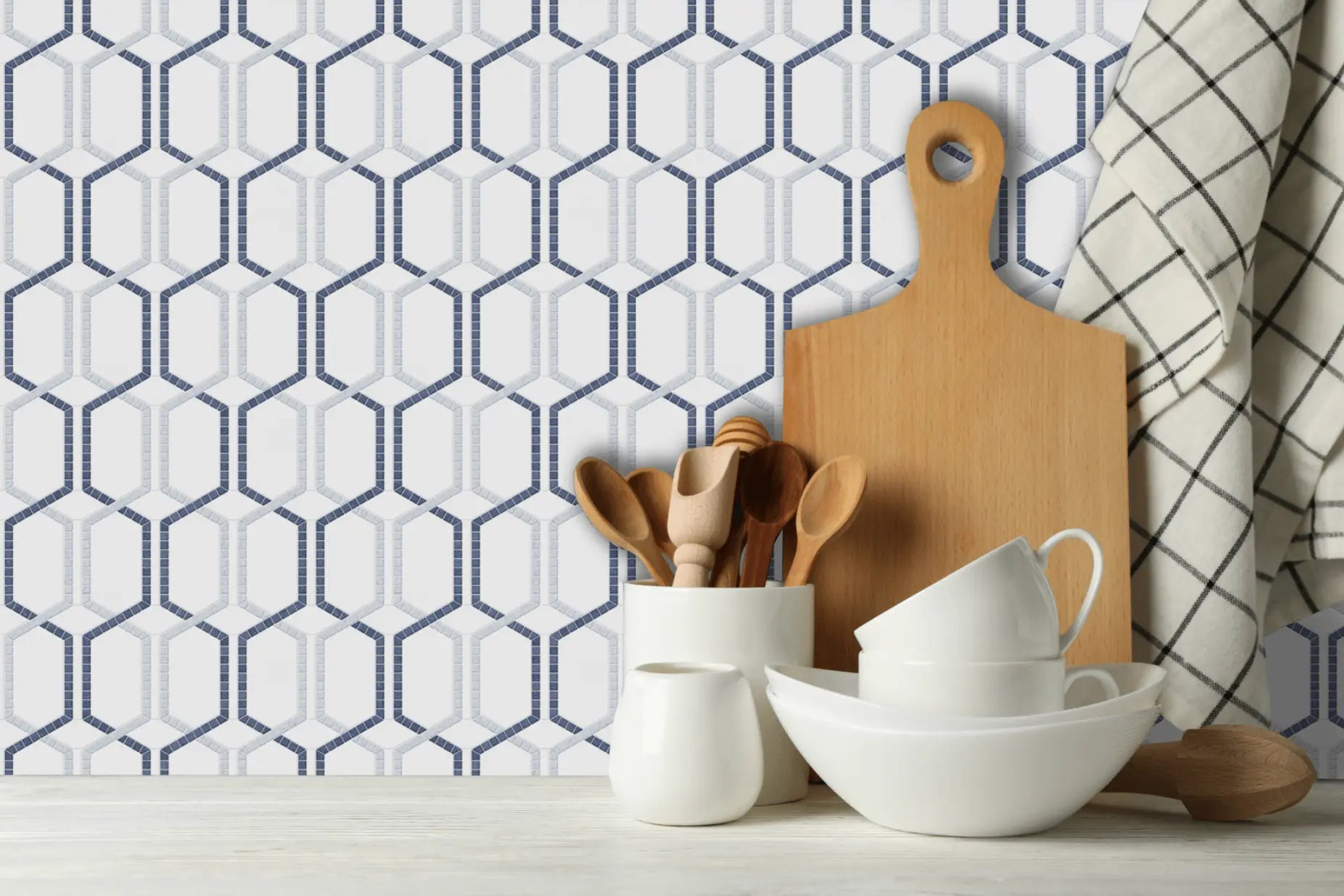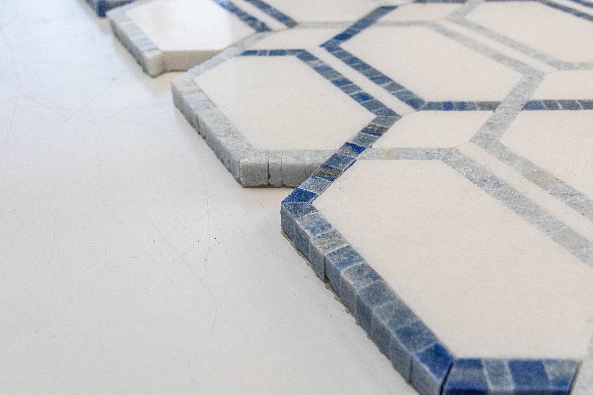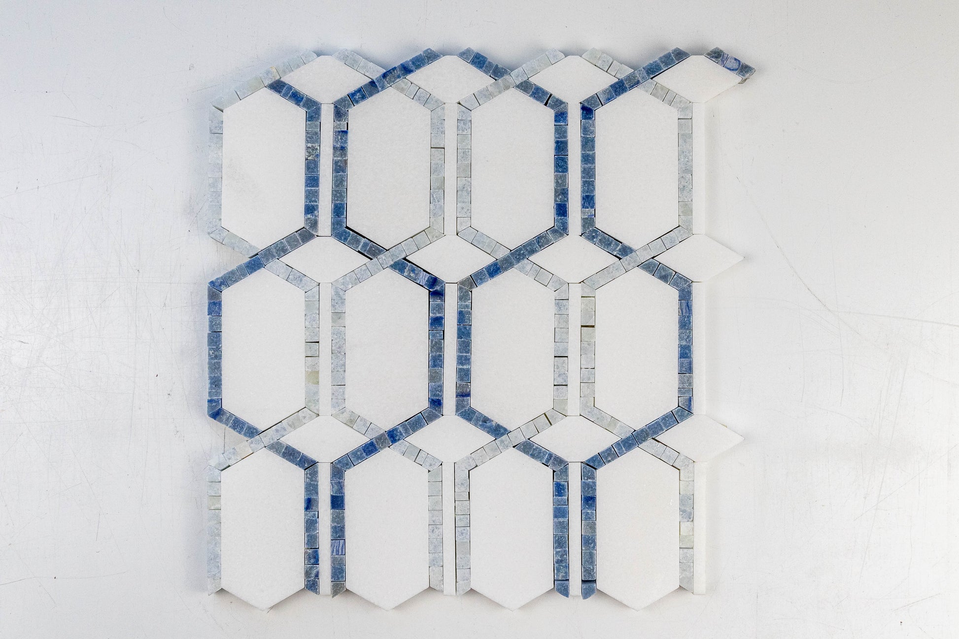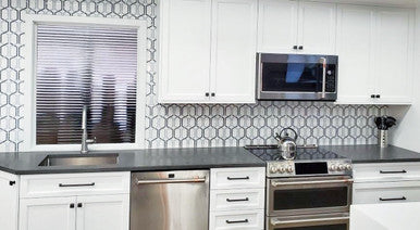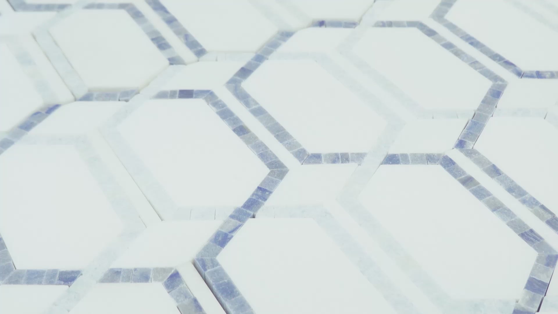 Bring a breeze of coastal elegance to the kitchen with Tahiti. Luminous Thassos anchors the design while soft Blue Celeste and the ocean-deep striations of Azul Macaubas trace a refined, elongated hex motif that shimmers like light on water. Choose Tahiti for a focal backsplash that feels fresh, airy and effortlessly sophisticated.