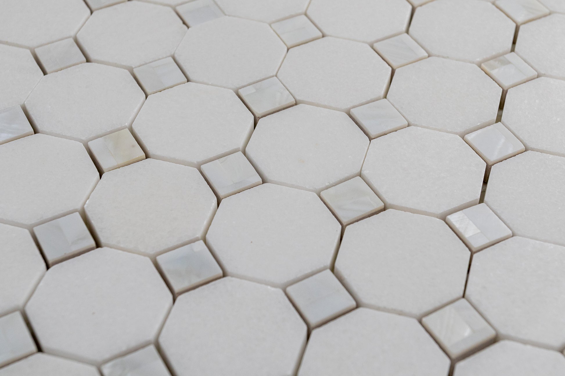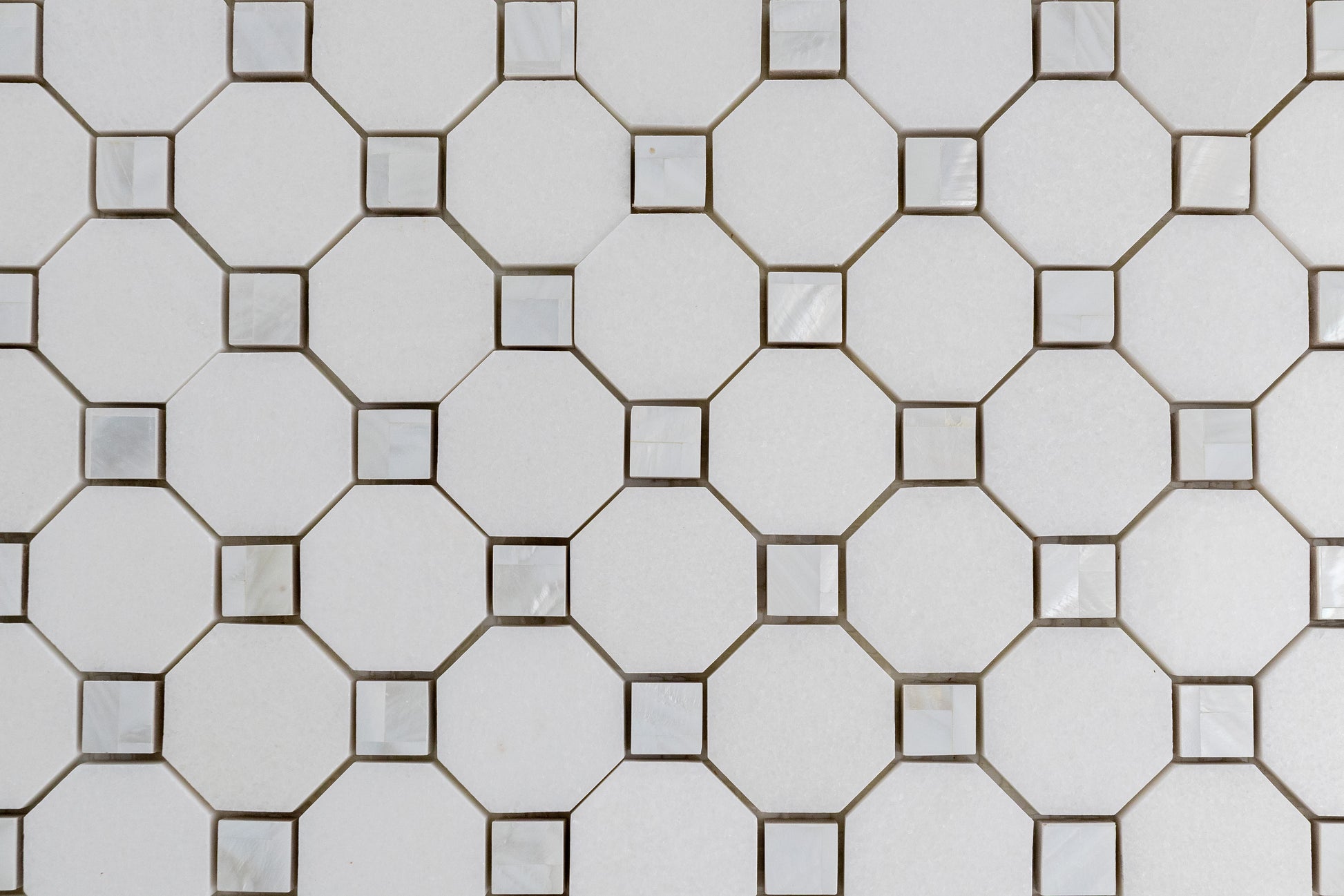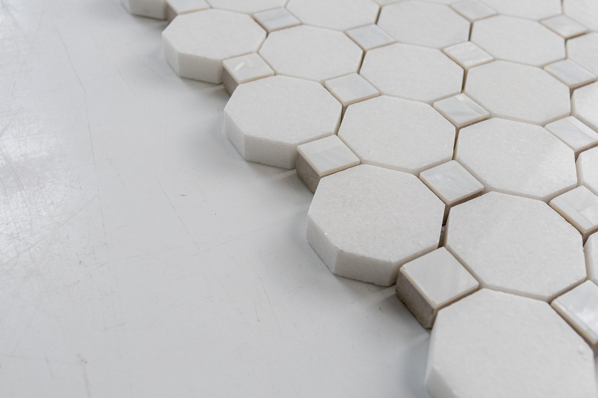 A hexagon in blues that is sure to grab your attention. Thassos, blue celeste, and paperwhite work great together and can be paired with neutral wood tones or cool whites and greys to create a unique space for any design.