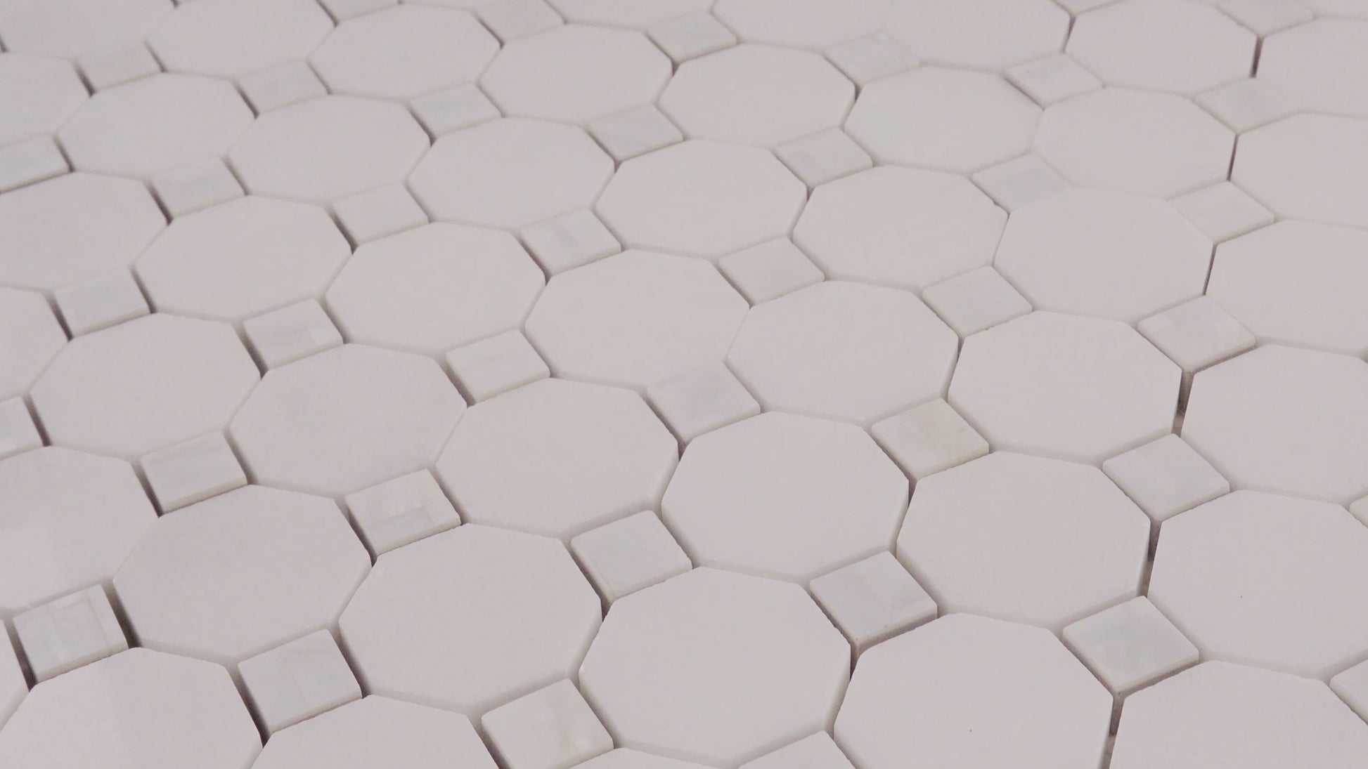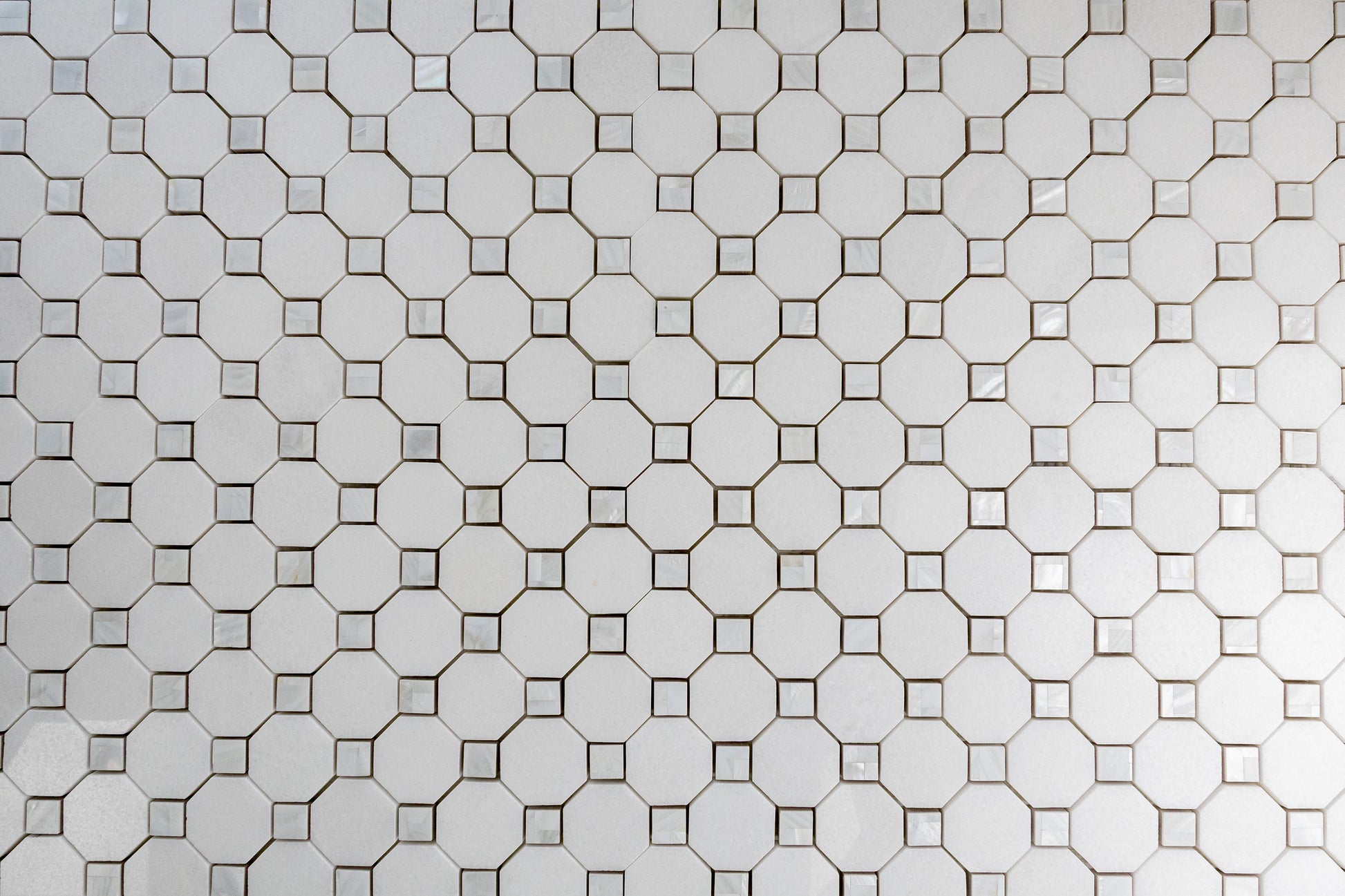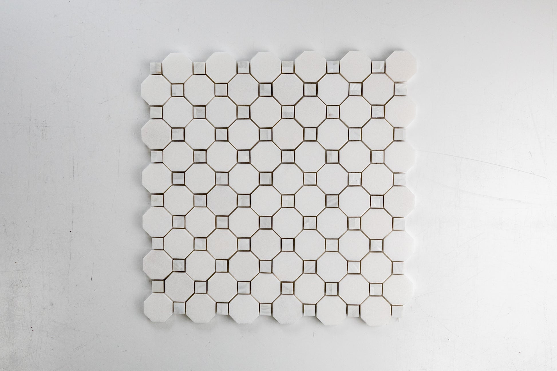 A hexagon in blues that is sure to grab your attention. Thassos, blue celeste, and paperwhite work great together and can be paired with neutral wood tones or cool whites and greys to create a unique space for any design.