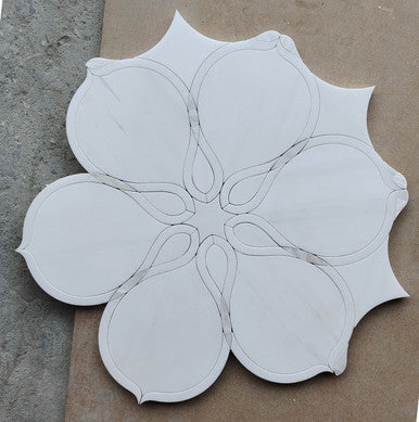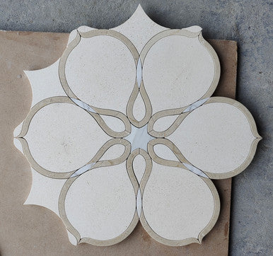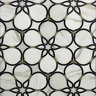 Stunning Trinity is an organic floral waterjet with small star details throughout. All Waterjet patterns are available for customization, allowing you to tailor stones, colors, materials, and finishes to match your unique vision.